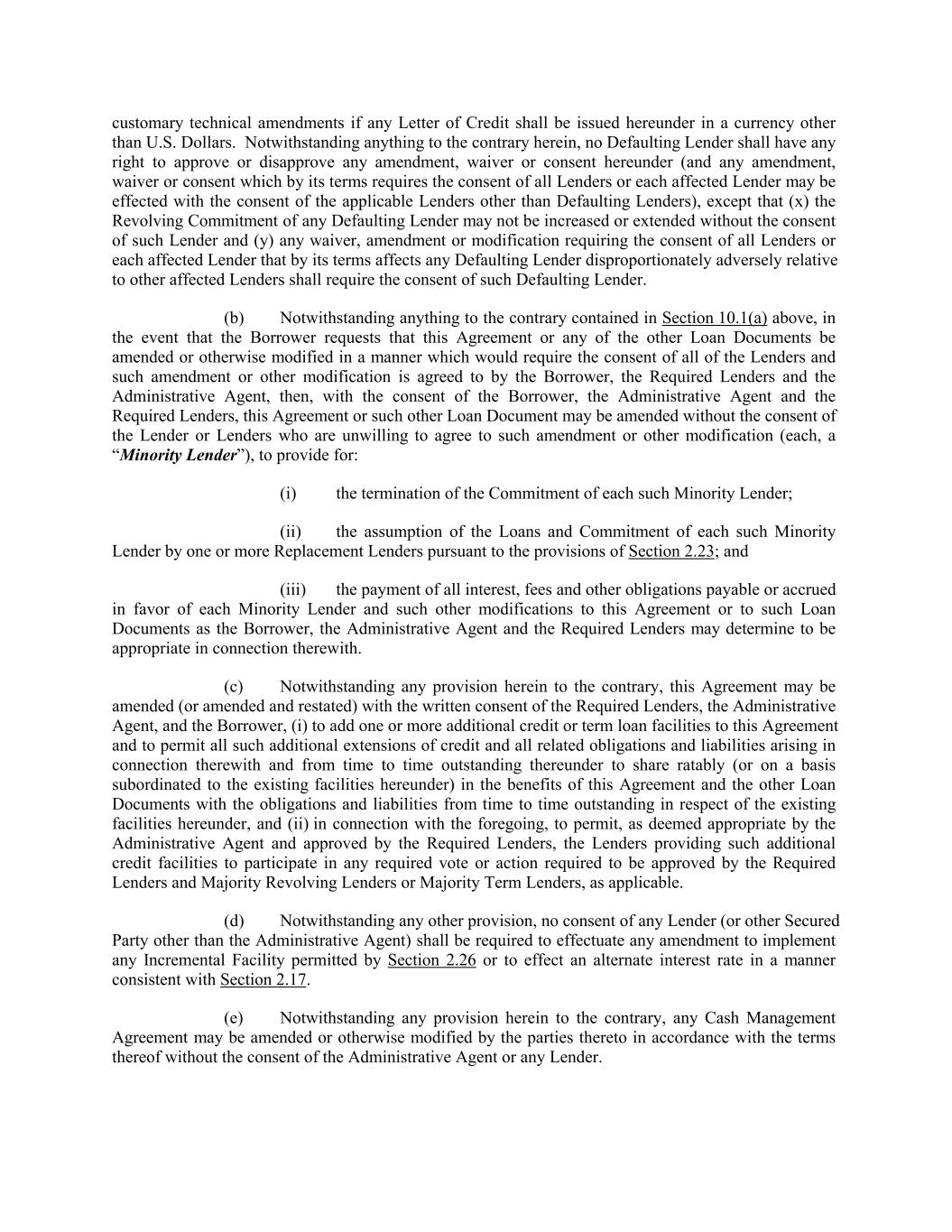 customary technical amendments if any Letter of Credit shall be issued hereunder in a currency other than U.S. Dollars. Notwithstanding anything to the contrary herein, no Defaulting Lender shall have any right to approve or disapprove any amendment, waiver or consent hereunder (and any amendment, waiver or consent which by its terms requires the consent of all Lenders or each affected Lender may be effected with the consent of the applicable Lenders other than Defaulting Lenders), except that (x) the Revolving Commitment of any Defaulting Lender may not be increased or extended without the consent of such Lender and (y) any waiver, amendment or modification requiring the consent of all Lenders or each affected Lender that by its terms affects any Defaulting Lender disproportionately adversely relative to other affected Lenders shall require the consent of such Defaulting Lender. (b) Notwithstanding anything to the contrary contained in Section 10.1(a) above, in the event that the Borrower requests that this Agreement or any of the other Loan Documents be amended or otherwise modified in a manner which would require the consent of all of the Lenders and such amendment or other modification is agreed to by the Borrower, the Required Lenders and the Administrative Agent, then, with the consent of the Borrower, the Administrative Agent and the Required Lenders, this Agreement or such other Loan Document may be amended without the consent of the Lender or Lenders who are unwilling to agree to such amendment or other modification (each, a “Minority Lender”), to provide for: (i) the termination of the Commitment of each such Minority Lender; (ii) the assumption of the Loans and Commitment of each such Minority Lender by one or more Replacement Lenders pursuant to the provisions of Section 2.23; and (iii) the payment of all interest, fees and other obligations payable or accrued in favor of each Minority Lender and such other modifications to this Agreement or to such Loan Documents as the Borrower, the Administrative Agent and the Required Lenders may determine to be appropriate in connection therewith. (c) Notwithstanding any provision herein to the contrary, this Agreement may be amended (or amended and restated) with the written consent of the Required Lenders, the Administrative Agent, and the Borrower, (i) to add one or more additional credit or term loan facilities to this Agreement and to permit all such additional extensions of credit and all related obligations and liabilities arising in connection therewith and from time to time outstanding thereunder to share ratably (or on a basis subordinated to the existing facilities hereunder) in the benefits of this Agreement and the other Loan Documents with the obligations and liabilities from time to time outstanding in respect of the existing facilities hereunder, and (ii) in connection with the foregoing, to permit, as deemed appropriate by the Administrative Agent and approved by the Required Lenders, the Lenders providing such additional credit facilities to participate in any required vote or action required to be approved by the Required Lenders and Majority Revolving Lenders or Majority Term Lenders, as applicable. (d) Notwithstanding any other provision, no consent of any Lender (or other Secured Party other than the Administrative Agent) shall be required to effectuate any amendment to implement any Incremental Facility permitted by Section 2.26 or to effect an alternate interest rate in a manner consistent with Section 2.17. (e) Notwithstanding any provision herein to the contrary, any Cash Management Agreement may be amended or otherwise modified by the parties thereto in accordance with the terms thereof without the consent of the Administrative Agent or any Lender.