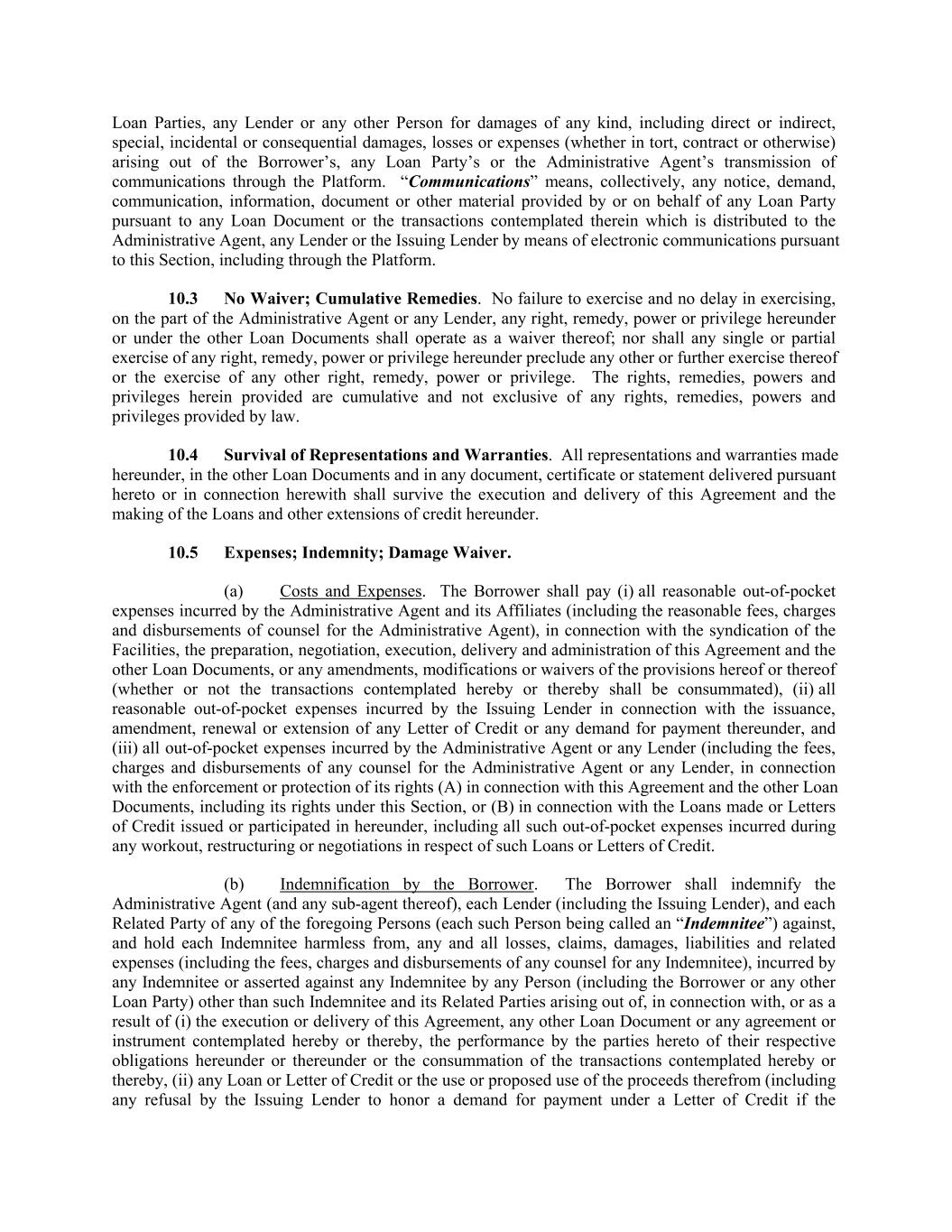 Loan Parties, any Lender or any other Person for damages of any kind, including direct or indirect, special, incidental or consequential damages, losses or expenses (whether in tort, contract or otherwise) arising out of the Borrower’s, any Loan Party’s or the Administrative Agent’s transmission of communications through the Platform. “Communications” means, collectively, any notice, demand, communication, information, document or other material provided by or on behalf of any Loan Party pursuant to any Loan Document or the transactions contemplated therein which is distributed to the Administrative Agent, any Lender or the Issuing Lender by means of electronic communications pursuant to this Section, including through the Platform. 10.3 No Waiver; Cumulative Remedies. No failure to exercise and no delay in exercising, on the part of the Administrative Agent or any Lender, any right, remedy, power or privilege hereunder or under the other Loan Documents shall operate as a waiver thereof; nor shall any single or partial exercise of any right, remedy, power or privilege hereunder preclude any other or further exercise thereof or the exercise of any other right, remedy, power or privilege. The rights, remedies, powers and privileges herein provided are cumulative and not exclusive of any rights, remedies, powers and privileges provided by law. 10.4 Survival of Representations and Warranties. All representations and warranties made hereunder, in the other Loan Documents and in any document, certificate or statement delivered pursuant hereto or in connection herewith shall survive the execution and delivery of this Agreement and the making of the Loans and other extensions of credit hereunder. 10.5 Expenses; Indemnity; Damage Waiver. (a) Costs and Expenses. The Borrower shall pay (i) all reasonable out-of-pocket expenses incurred by the Administrative Agent and its Affiliates (including the reasonable fees, charges and disbursements of counsel for the Administrative Agent), in connection with the syndication of the Facilities, the preparation, negotiation, execution, delivery and administration of this Agreement and the other Loan Documents, or any amendments, modifications or waivers of the provisions hereof or thereof (whether or not the transactions contemplated hereby or thereby shall be consummated), (ii) all reasonable out-of-pocket expenses incurred by the Issuing Lender in connection with the issuance, amendment, renewal or extension of any Letter of Credit or any demand for payment thereunder, and (iii) all out-of-pocket expenses incurred by the Administrative Agent or any Lender (including the fees, charges and disbursements of any counsel for the Administrative Agent or any Lender, in connection with the enforcement or protection of its rights (A) in connection with this Agreement and the other Loan Documents, including its rights under this Section, or (B) in connection with the Loans made or Letters of Credit issued or participated in hereunder, including all such out-of-pocket expenses incurred during any workout, restructuring or negotiations in respect of such Loans or Letters of Credit. (b) Indemnification by the Borrower. The Borrower shall indemnify the Administrative Agent (and any sub-agent thereof), each Lender (including the Issuing Lender), and each Related Party of any of the foregoing Persons (each such Person being called an “Indemnitee”) against, and hold each Indemnitee harmless from, any and all losses, claims, damages, liabilities and related expenses (including the fees, charges and disbursements of any counsel for any Indemnitee), incurred by any Indemnitee or asserted against any Indemnitee by any Person (including the Borrower or any other Loan Party) other than such Indemnitee and its Related Parties arising out of, in connection with, or as a result of (i) the execution or delivery of this Agreement, any other Loan Document or any agreement or instrument contemplated hereby or thereby, the performance by the parties hereto of their respective obligations hereunder or thereunder or the consummation of the transactions contemplated hereby or thereby, (ii) any Loan or Letter of Credit or the use or proposed use of the proceeds therefrom (including any refusal by the Issuing Lender to honor a demand for payment under a Letter of Credit if the