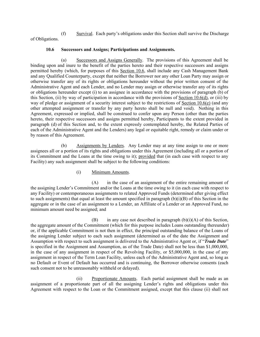 (f) Survival. Each party’s obligations under this Section shall survive the Discharge of Obligations. 10.6 Successors and Assigns; Participations and Assignments. (a) Successors and Assigns Generally. The provisions of this Agreement shall be binding upon and inure to the benefit of the parties hereto and their respective successors and assigns permitted hereby (which, for purposes of this Section 10.6, shall include any Cash Management Bank and any Qualified Counterparty, except that neither the Borrower nor any other Loan Party may assign or otherwise transfer any of its rights or obligations hereunder without the prior written consent of the Administrative Agent and each Lender, and no Lender may assign or otherwise transfer any of its rights or obligations hereunder except (i) to an assignee in accordance with the provisions of paragraph (b) of this Section, (ii) by way of participation in accordance with the provisions of Section 10.6(d), or (iii) by way of pledge or assignment of a security interest subject to the restrictions of Section 10.6(e) (and any other attempted assignment or transfer by any party hereto shall be null and void). Nothing in this Agreement, expressed or implied, shall be construed to confer upon any Person (other than the parties hereto, their respective successors and assigns permitted hereby, Participants to the extent provided in paragraph (d) of this Section and, to the extent expressly contemplated hereby, the Related Parties of each of the Administrative Agent and the Lenders) any legal or equitable right, remedy or claim under or by reason of this Agreement. (b) Assignments by Lenders. Any Lender may at any time assign to one or more assignees all or a portion of its rights and obligations under this Agreement (including all or a portion of its Commitment and the Loans at the time owing to it); provided that (in each case with respect to any Facility) any such assignment shall be subject to the following conditions: (i) Minimum Amounts. (A) in the case of an assignment of the entire remaining amount of the assigning Lender’s Commitment and/or the Loans at the time owing to it (in each case with respect to any Facility) or contemporaneous assignments to related Approved Funds (determined after giving effect to such assignments) that equal at least the amount specified in paragraph (b)(i)(B) of this Section in the aggregate or in the case of an assignment to a Lender, an Affiliate of a Lender or an Approved Fund, no minimum amount need be assigned; and (B) in any case not described in paragraph (b)(i)(A) of this Section, the aggregate amount of the Commitment (which for this purpose includes Loans outstanding thereunder) or, if the applicable Commitment is not then in effect, the principal outstanding balance of the Loans of the assigning Lender subject to each such assignment (determined as of the date the Assignment and Assumption with respect to such assignment is delivered to the Administrative Agent or, if “Trade Date” is specified in the Assignment and Assumption, as of the Trade Date) shall not be less than $1,000,000, in the case of any assignment in respect of the Revolving Facility, or $5,000,000, in the case of any assignment in respect of the Term Loan Facility, unless each of the Administrative Agent and, so long as no Default or Event of Default has occurred and is continuing, the Borrower otherwise consents (each such consent not to be unreasonably withheld or delayed). (ii) Proportionate Amounts. Each partial assignment shall be made as an assignment of a proportionate part of all the assigning Lender’s rights and obligations under this Agreement with respect to the Loan or the Commitment assigned, except that this clause (ii) shall not