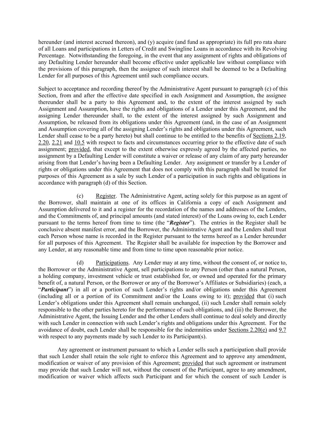 hereunder (and interest accrued thereon), and (y) acquire (and fund as appropriate) its full pro rata share of all Loans and participations in Letters of Credit and Swingline Loans in accordance with its Revolving Percentage. Notwithstanding the foregoing, in the event that any assignment of rights and obligations of any Defaulting Lender hereunder shall become effective under applicable law without compliance with the provisions of this paragraph, then the assignee of such interest shall be deemed to be a Defaulting Lender for all purposes of this Agreement until such compliance occurs. Subject to acceptance and recording thereof by the Administrative Agent pursuant to paragraph (c) of this Section, from and after the effective date specified in each Assignment and Assumption, the assignee thereunder shall be a party to this Agreement and, to the extent of the interest assigned by such Assignment and Assumption, have the rights and obligations of a Lender under this Agreement, and the assigning Lender thereunder shall, to the extent of the interest assigned by such Assignment and Assumption, be released from its obligations under this Agreement (and, in the case of an Assignment and Assumption covering all of the assigning Lender’s rights and obligations under this Agreement, such Lender shall cease to be a party hereto) but shall continue to be entitled to the benefits of Sections 2.19, 2.20, 2.21 and 10.5 with respect to facts and circumstances occurring prior to the effective date of such assignment; provided, that except to the extent otherwise expressly agreed by the affected parties, no assignment by a Defaulting Lender will constitute a waiver or release of any claim of any party hereunder arising from that Lender’s having been a Defaulting Lender. Any assignment or transfer by a Lender of rights or obligations under this Agreement that does not comply with this paragraph shall be treated for purposes of this Agreement as a sale by such Lender of a participation in such rights and obligations in accordance with paragraph (d) of this Section. (c) Register. The Administrative Agent, acting solely for this purpose as an agent of the Borrower, shall maintain at one of its offices in California a copy of each Assignment and Assumption delivered to it and a register for the recordation of the names and addresses of the Lenders, and the Commitments of, and principal amounts (and stated interest) of the Loans owing to, each Lender pursuant to the terms hereof from time to time (the “Register”). The entries in the Register shall be conclusive absent manifest error, and the Borrower, the Administrative Agent and the Lenders shall treat each Person whose name is recorded in the Register pursuant to the terms hereof as a Lender hereunder for all purposes of this Agreement. The Register shall be available for inspection by the Borrower and any Lender, at any reasonable time and from time to time upon reasonable prior notice. (d) Participations. Any Lender may at any time, without the consent of, or notice to, the Borrower or the Administrative Agent, sell participations to any Person (other than a natural Person, a holding company, investment vehicle or trust established for, or owned and operated for the primary benefit of, a natural Person, or the Borrower or any of the Borrower’s Affiliates or Subsidiaries) (each, a “Participant”) in all or a portion of such Lender’s rights and/or obligations under this Agreement (including all or a portion of its Commitment and/or the Loans owing to it); provided that (i) such Lender’s obligations under this Agreement shall remain unchanged, (ii) such Lender shall remain solely responsible to the other parties hereto for the performance of such obligations, and (iii) the Borrower, the Administrative Agent, the Issuing Lender and the other Lenders shall continue to deal solely and directly with such Lender in connection with such Lender’s rights and obligations under this Agreement. For the avoidance of doubt, each Lender shall be responsible for the indemnities under Sections 2.20(e) and 9.7 with respect to any payments made by such Lender to its Participant(s). Any agreement or instrument pursuant to which a Lender sells such a participation shall provide that such Lender shall retain the sole right to enforce this Agreement and to approve any amendment, modification or waiver of any provision of this Agreement; provided that such agreement or instrument may provide that such Lender will not, without the consent of the Participant, agree to any amendment, modification or waiver which affects such Participant and for which the consent of such Lender is