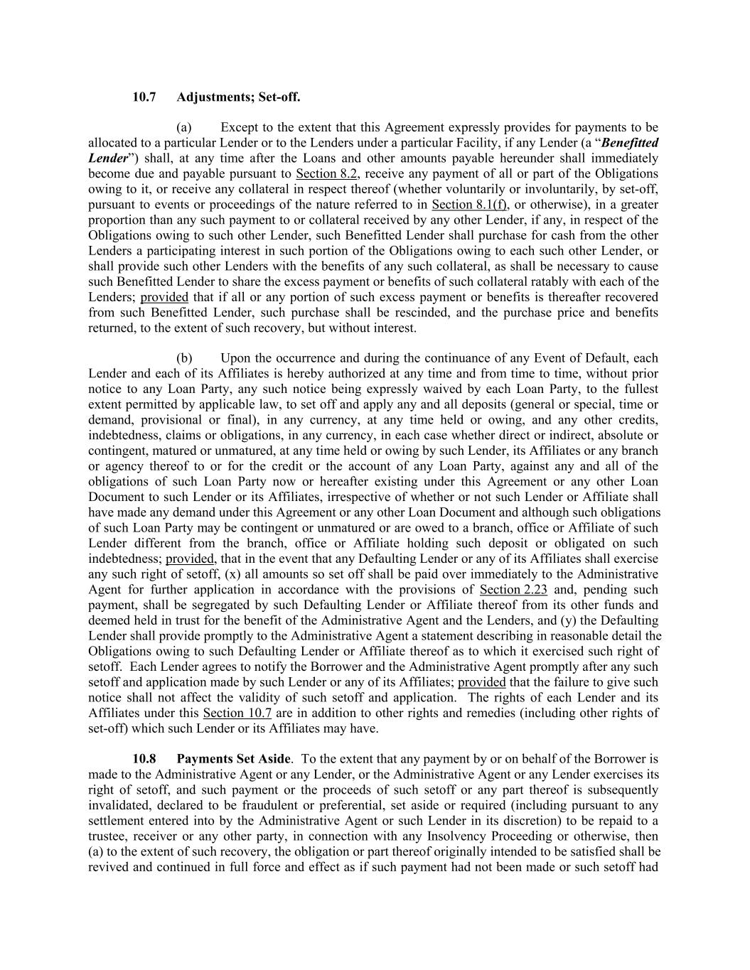 10.7 Adjustments; Set-off. (a) Except to the extent that this Agreement expressly provides for payments to be allocated to a particular Lender or to the Lenders under a particular Facility, if any Lender (a “Benefitted Lender”) shall, at any time after the Loans and other amounts payable hereunder shall immediately become due and payable pursuant to Section 8.2, receive any payment of all or part of the Obligations owing to it, or receive any collateral in respect thereof (whether voluntarily or involuntarily, by set-off, pursuant to events or proceedings of the nature referred to in Section 8.1(f), or otherwise), in a greater proportion than any such payment to or collateral received by any other Lender, if any, in respect of the Obligations owing to such other Lender, such Benefitted Lender shall purchase for cash from the other Lenders a participating interest in such portion of the Obligations owing to each such other Lender, or shall provide such other Lenders with the benefits of any such collateral, as shall be necessary to cause such Benefitted Lender to share the excess payment or benefits of such collateral ratably with each of the Lenders; provided that if all or any portion of such excess payment or benefits is thereafter recovered from such Benefitted Lender, such purchase shall be rescinded, and the purchase price and benefits returned, to the extent of such recovery, but without interest. (b) Upon the occurrence and during the continuance of any Event of Default, each Lender and each of its Affiliates is hereby authorized at any time and from time to time, without prior notice to any Loan Party, any such notice being expressly waived by each Loan Party, to the fullest extent permitted by applicable law, to set off and apply any and all deposits (general or special, time or demand, provisional or final), in any currency, at any time held or owing, and any other credits, indebtedness, claims or obligations, in any currency, in each case whether direct or indirect, absolute or contingent, matured or unmatured, at any time held or owing by such Lender, its Affiliates or any branch or agency thereof to or for the credit or the account of any Loan Party, against any and all of the obligations of such Loan Party now or hereafter existing under this Agreement or any other Loan Document to such Lender or its Affiliates, irrespective of whether or not such Lender or Affiliate shall have made any demand under this Agreement or any other Loan Document and although such obligations of such Loan Party may be contingent or unmatured or are owed to a branch, office or Affiliate of such Lender different from the branch, office or Affiliate holding such deposit or obligated on such indebtedness; provided, that in the event that any Defaulting Lender or any of its Affiliates shall exercise any such right of setoff, (x) all amounts so set off shall be paid over immediately to the Administrative Agent for further application in accordance with the provisions of Section 2.23 and, pending such payment, shall be segregated by such Defaulting Lender or Affiliate thereof from its other funds and deemed held in trust for the benefit of the Administrative Agent and the Lenders, and (y) the Defaulting Lender shall provide promptly to the Administrative Agent a statement describing in reasonable detail the Obligations owing to such Defaulting Lender or Affiliate thereof as to which it exercised such right of setoff. Each Lender agrees to notify the Borrower and the Administrative Agent promptly after any such setoff and application made by such Lender or any of its Affiliates; provided that the failure to give such notice shall not affect the validity of such setoff and application. The rights of each Lender and its Affiliates under this Section 10.7 are in addition to other rights and remedies (including other rights of set-off) which such Lender or its Affiliates may have. 10.8 Payments Set Aside. To the extent that any payment by or on behalf of the Borrower is made to the Administrative Agent or any Lender, or the Administrative Agent or any Lender exercises its right of setoff, and such payment or the proceeds of such setoff or any part thereof is subsequently invalidated, declared to be fraudulent or preferential, set aside or required (including pursuant to any settlement entered into by the Administrative Agent or such Lender in its discretion) to be repaid to a trustee, receiver or any other party, in connection with any Insolvency Proceeding or otherwise, then (a) to the extent of such recovery, the obligation or part thereof originally intended to be satisfied shall be revived and continued in full force and effect as if such payment had not been made or such setoff had