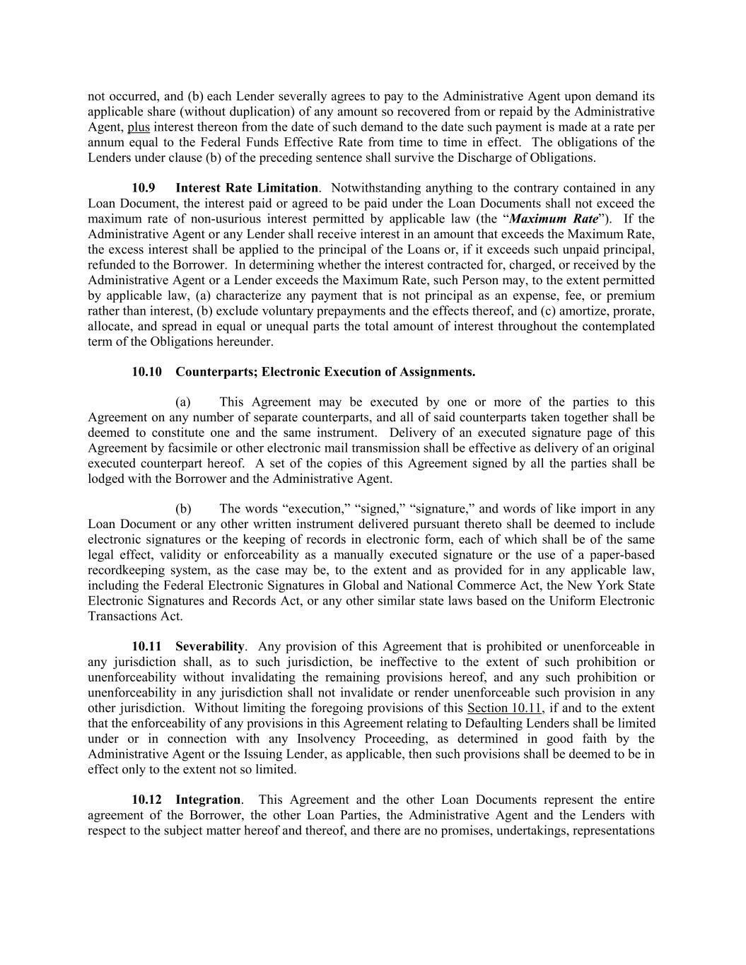 not occurred, and (b) each Lender severally agrees to pay to the Administrative Agent upon demand its applicable share (without duplication) of any amount so recovered from or repaid by the Administrative Agent, plus interest thereon from the date of such demand to the date such payment is made at a rate per annum equal to the Federal Funds Effective Rate from time to time in effect. The obligations of the Lenders under clause (b) of the preceding sentence shall survive the Discharge of Obligations. 10.9 Interest Rate Limitation. Notwithstanding anything to the contrary contained in any Loan Document, the interest paid or agreed to be paid under the Loan Documents shall not exceed the maximum rate of non-usurious interest permitted by applicable law (the “Maximum Rate”). If the Administrative Agent or any Lender shall receive interest in an amount that exceeds the Maximum Rate, the excess interest shall be applied to the principal of the Loans or, if it exceeds such unpaid principal, refunded to the Borrower. In determining whether the interest contracted for, charged, or received by the Administrative Agent or a Lender exceeds the Maximum Rate, such Person may, to the extent permitted by applicable law, (a) characterize any payment that is not principal as an expense, fee, or premium rather than interest, (b) exclude voluntary prepayments and the effects thereof, and (c) amortize, prorate, allocate, and spread in equal or unequal parts the total amount of interest throughout the contemplated term of the Obligations hereunder. 10.10 Counterparts; Electronic Execution of Assignments. (a) This Agreement may be executed by one or more of the parties to this Agreement on any number of separate counterparts, and all of said counterparts taken together shall be deemed to constitute one and the same instrument. Delivery of an executed signature page of this Agreement by facsimile or other electronic mail transmission shall be effective as delivery of an original executed counterpart hereof. A set of the copies of this Agreement signed by all the parties shall be lodged with the Borrower and the Administrative Agent. (b) The words “execution,” “signed,” “signature,” and words of like import in any Loan Document or any other written instrument delivered pursuant thereto shall be deemed to include electronic signatures or the keeping of records in electronic form, each of which shall be of the same legal effect, validity or enforceability as a manually executed signature or the use of a paper-based recordkeeping system, as the case may be, to the extent and as provided for in any applicable law, including the Federal Electronic Signatures in Global and National Commerce Act, the New York State Electronic Signatures and Records Act, or any other similar state laws based on the Uniform Electronic Transactions Act. 10.11 Severability. Any provision of this Agreement that is prohibited or unenforceable in any jurisdiction shall, as to such jurisdiction, be ineffective to the extent of such prohibition or unenforceability without invalidating the remaining provisions hereof, and any such prohibition or unenforceability in any jurisdiction shall not invalidate or render unenforceable such provision in any other jurisdiction. Without limiting the foregoing provisions of this Section 10.11, if and to the extent that the enforceability of any provisions in this Agreement relating to Defaulting Lenders shall be limited under or in connection with any Insolvency Proceeding, as determined in good faith by the Administrative Agent or the Issuing Lender, as applicable, then such provisions shall be deemed to be in effect only to the extent not so limited. 10.12 Integration. This Agreement and the other Loan Documents represent the entire agreement of the Borrower, the other Loan Parties, the Administrative Agent and the Lenders with respect to the subject matter hereof and thereof, and there are no promises, undertakings, representations