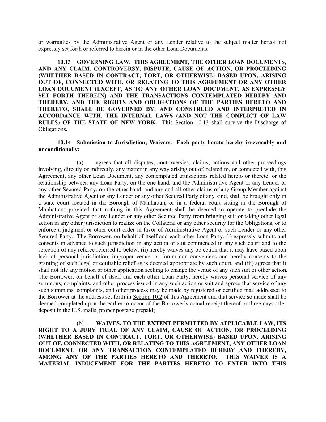 or warranties by the Administrative Agent or any Lender relative to the subject matter hereof not expressly set forth or referred to herein or in the other Loan Documents. 10.13 GOVERNING LAW. THIS AGREEMENT, THE OTHER LOAN DOCUMENTS, AND ANY CLAIM, CONTROVERSY, DISPUTE, CAUSE OF ACTION, OR PROCEEDING (WHETHER BASED IN CONTRACT, TORT, OR OTHERWISE) BASED UPON, ARISING OUT OF, CONNECTED WITH, OR RELATING TO THIS AGREEMENT OR ANY OTHER LOAN DOCUMENT (EXCEPT, AS TO ANY OTHER LOAN DOCUMENT, AS EXPRESSLY SET FORTH THEREIN) AND THE TRANSACTIONS CONTEMPLATED HEREBY AND THEREBY, AND THE RIGHTS AND OBLIGATIONS OF THE PARTIES HERETO AND THERETO, SHALL BE GOVERNED BY, AND CONSTRUED AND INTERPRETED IN ACCORDANCE WITH, THE INTERNAL LAWS (AND NOT THE CONFLICT OF LAW RULES) OF THE STATE OF NEW YORK. This Section 10.13 shall survive the Discharge of Obligations. 10.14 Submission to Jurisdiction; Waivers. Each party hereto hereby irrevocably and unconditionally: (a) agrees that all disputes, controversies, claims, actions and other proceedings involving, directly or indirectly, any matter in any way arising out of, related to, or connected with, this Agreement, any other Loan Document, any contemplated transactions related hereto or thereto, or the relationship between any Loan Party, on the one hand, and the Administrative Agent or any Lender or any other Secured Party, on the other hand, and any and all other claims of any Group Member against the Administrative Agent or any Lender or any other Secured Party of any kind, shall be brought only in a state court located in the Borough of Manhattan, or in a federal court sitting in the Borough of Manhattan; provided that nothing in this Agreement shall be deemed to operate to preclude the Administrative Agent or any Lender or any other Secured Party from bringing suit or taking other legal action in any other jurisdiction to realize on the Collateral or any other security for the Obligations, or to enforce a judgment or other court order in favor of Administrative Agent or such Lender or any other Secured Party. The Borrower, on behalf of itself and each other Loan Party, (i) expressly submits and consents in advance to such jurisdiction in any action or suit commenced in any such court and to the selection of any referee referred to below, (ii) hereby waives any objection that it may have based upon lack of personal jurisdiction, improper venue, or forum non conveniens and hereby consents to the granting of such legal or equitable relief as is deemed appropriate by such court, and (iii) agrees that it shall not file any motion or other application seeking to change the venue of any such suit or other action. The Borrower, on behalf of itself and each other Loan Party, hereby waives personal service of any summons, complaints, and other process issued in any such action or suit and agrees that service of any such summons, complaints, and other process may be made by registered or certified mail addressed to the Borrower at the address set forth in Section 10.2 of this Agreement and that service so made shall be deemed completed upon the earlier to occur of the Borrower’s actual receipt thereof or three days after deposit in the U.S. mails, proper postage prepaid; (b) WAIVES, TO THE EXTENT PERMITTED BY APPLICABLE LAW, ITS RIGHT TO A JURY TRIAL OF ANY CLAIM, CAUSE OF ACTION, OR PROCEEDING (WHETHER BASED IN CONTRACT, TORT, OR OTHERWISE) BASED UPON, ARISING OUT OF, CONNECTED WITH, OR RELATING TO THIS AGREEMENT, ANY OTHER LOAN DOCUMENT, OR ANY TRANSACTION CONTEMPLATED HEREBY AND THEREBY, AMONG ANY OF THE PARTIES HERETO AND THERETO. THIS WAIVER IS A MATERIAL INDUCEMENT FOR THE PARTIES HERETO TO ENTER INTO THIS