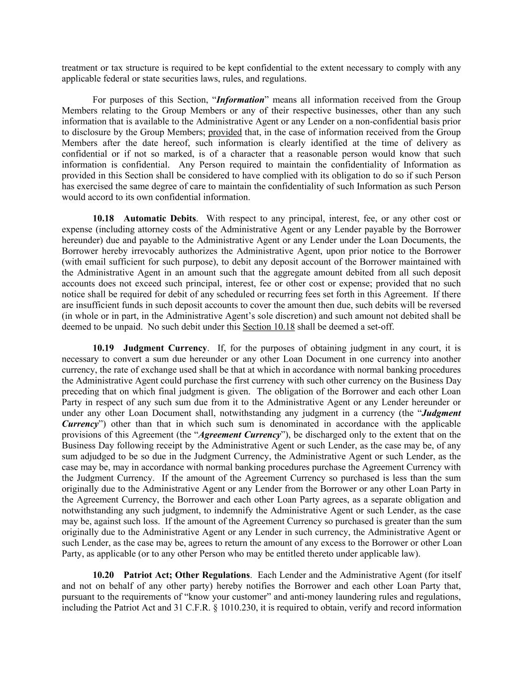 treatment or tax structure is required to be kept confidential to the extent necessary to comply with any applicable federal or state securities laws, rules, and regulations. For purposes of this Section, “Information” means all information received from the Group Members relating to the Group Members or any of their respective businesses, other than any such information that is available to the Administrative Agent or any Lender on a non-confidential basis prior to disclosure by the Group Members; provided that, in the case of information received from the Group Members after the date hereof, such information is clearly identified at the time of delivery as confidential or if not so marked, is of a character that a reasonable person would know that such information is confidential. Any Person required to maintain the confidentiality of Information as provided in this Section shall be considered to have complied with its obligation to do so if such Person has exercised the same degree of care to maintain the confidentiality of such Information as such Person would accord to its own confidential information. 10.18 Automatic Debits. With respect to any principal, interest, fee, or any other cost or expense (including attorney costs of the Administrative Agent or any Lender payable by the Borrower hereunder) due and payable to the Administrative Agent or any Lender under the Loan Documents, the Borrower hereby irrevocably authorizes the Administrative Agent, upon prior notice to the Borrower (with email sufficient for such purpose), to debit any deposit account of the Borrower maintained with the Administrative Agent in an amount such that the aggregate amount debited from all such deposit accounts does not exceed such principal, interest, fee or other cost or expense; provided that no such notice shall be required for debit of any scheduled or recurring fees set forth in this Agreement. If there are insufficient funds in such deposit accounts to cover the amount then due, such debits will be reversed (in whole or in part, in the Administrative Agent’s sole discretion) and such amount not debited shall be deemed to be unpaid. No such debit under this Section 10.18 shall be deemed a set-off. 10.19 Judgment Currency. If, for the purposes of obtaining judgment in any court, it is necessary to convert a sum due hereunder or any other Loan Document in one currency into another currency, the rate of exchange used shall be that at which in accordance with normal banking procedures the Administrative Agent could purchase the first currency with such other currency on the Business Day preceding that on which final judgment is given. The obligation of the Borrower and each other Loan Party in respect of any such sum due from it to the Administrative Agent or any Lender hereunder or under any other Loan Document shall, notwithstanding any judgment in a currency (the “Judgment Currency”) other than that in which such sum is denominated in accordance with the applicable provisions of this Agreement (the “Agreement Currency”), be discharged only to the extent that on the Business Day following receipt by the Administrative Agent or such Lender, as the case may be, of any sum adjudged to be so due in the Judgment Currency, the Administrative Agent or such Lender, as the case may be, may in accordance with normal banking procedures purchase the Agreement Currency with the Judgment Currency. If the amount of the Agreement Currency so purchased is less than the sum originally due to the Administrative Agent or any Lender from the Borrower or any other Loan Party in the Agreement Currency, the Borrower and each other Loan Party agrees, as a separate obligation and notwithstanding any such judgment, to indemnify the Administrative Agent or such Lender, as the case may be, against such loss. If the amount of the Agreement Currency so purchased is greater than the sum originally due to the Administrative Agent or any Lender in such currency, the Administrative Agent or such Lender, as the case may be, agrees to return the amount of any excess to the Borrower or other Loan Party, as applicable (or to any other Person who may be entitled thereto under applicable law). 10.20 Patriot Act; Other Regulations. Each Lender and the Administrative Agent (for itself and not on behalf of any other party) hereby notifies the Borrower and each other Loan Party that, pursuant to the requirements of “know your customer” and anti-money laundering rules and regulations, including the Patriot Act and 31 C.F.R. § 1010.230, it is required to obtain, verify and record information