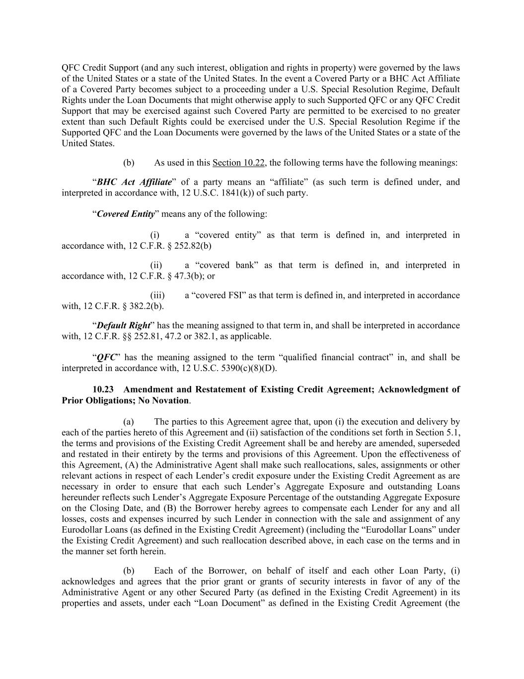 QFC Credit Support (and any such interest, obligation and rights in property) were governed by the laws of the United States or a state of the United States. In the event a Covered Party or a BHC Act Affiliate of a Covered Party becomes subject to a proceeding under a U.S. Special Resolution Regime, Default Rights under the Loan Documents that might otherwise apply to such Supported QFC or any QFC Credit Support that may be exercised against such Covered Party are permitted to be exercised to no greater extent than such Default Rights could be exercised under the U.S. Special Resolution Regime if the Supported QFC and the Loan Documents were governed by the laws of the United States or a state of the United States. (b) As used in this Section 10.22, the following terms have the following meanings: “BHC Act Affiliate” of a party means an “affiliate” (as such term is defined under, and interpreted in accordance with, 12 U.S.C. 1841(k)) of such party. “Covered Entity” means any of the following: (i) a “covered entity” as that term is defined in, and interpreted in accordance with, 12 C.F.R. § 252.82(b) (ii) a “covered bank” as that term is defined in, and interpreted in accordance with, 12 C.F.R. § 47.3(b); or (iii) a “covered FSI” as that term is defined in, and interpreted in accordance with, 12 C.F.R. § 382.2(b). “Default Right” has the meaning assigned to that term in, and shall be interpreted in accordance with, 12 C.F.R. §§ 252.81, 47.2 or 382.1, as applicable. “QFC” has the meaning assigned to the term “qualified financial contract” in, and shall be interpreted in accordance with, 12 U.S.C. 5390(c)(8)(D). 10.23 Amendment and Restatement of Existing Credit Agreement; Acknowledgment of Prior Obligations; No Novation. (a) The parties to this Agreement agree that, upon (i) the execution and delivery by each of the parties hereto of this Agreement and (ii) satisfaction of the conditions set forth in Section 5.1, the terms and provisions of the Existing Credit Agreement shall be and hereby are amended, superseded and restated in their entirety by the terms and provisions of this Agreement. Upon the effectiveness of this Agreement, (A) the Administrative Agent shall make such reallocations, sales, assignments or other relevant actions in respect of each Lender’s credit exposure under the Existing Credit Agreement as are necessary in order to ensure that each such Lender’s Aggregate Exposure and outstanding Loans hereunder reflects such Lender’s Aggregate Exposure Percentage of the outstanding Aggregate Exposure on the Closing Date, and (B) the Borrower hereby agrees to compensate each Lender for any and all losses, costs and expenses incurred by such Lender in connection with the sale and assignment of any Eurodollar Loans (as defined in the Existing Credit Agreement) (including the “Eurodollar Loans” under the Existing Credit Agreement) and such reallocation described above, in each case on the terms and in the manner set forth herein. (b) Each of the Borrower, on behalf of itself and each other Loan Party, (i) acknowledges and agrees that the prior grant or grants of security interests in favor of any of the Administrative Agent or any other Secured Party (as defined in the Existing Credit Agreement) in its properties and assets, under each “Loan Document” as defined in the Existing Credit Agreement (the