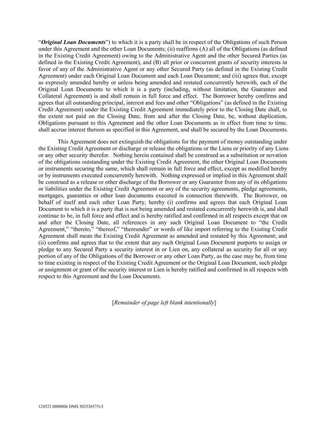 “Original Loan Documents”) to which it is a party shall be in respect of the Obligations of such Person under this Agreement and the other Loan Documents; (ii) reaffirms (A) all of the Obligations (as defined in the Existing Credit Agreement) owing to the Administrative Agent and the other Secured Parties (as defined in the Existing Credit Agreement), and (B) all prior or concurrent grants of security interests in favor of any of the Administrative Agent or any other Secured Party (as defined in the Existing Credit Agreement) under each Original Loan Document and each Loan Document; and (iii) agrees that, except as expressly amended hereby or unless being amended and restated concurrently herewith, each of the Original Loan Documents to which it is a party (including, without limitation, the Guarantee and Collateral Agreement) is and shall remain in full force and effect. The Borrower hereby confirms and agrees that all outstanding principal, interest and fees and other “Obligations” (as defined in the Existing Credit Agreement) under the Existing Credit Agreement immediately prior to the Closing Date shall, to the extent not paid on the Closing Date, from and after the Closing Date, be, without duplication, Obligations pursuant to this Agreement and the other Loan Documents as in effect from time to time, shall accrue interest thereon as specified in this Agreement, and shall be secured by the Loan Documents. This Agreement does not extinguish the obligations for the payment of money outstanding under the Existing Credit Agreement or discharge or release the obligations or the Liens or priority of any Liens or any other security therefor. Nothing herein contained shall be construed as a substitution or novation of the obligations outstanding under the Existing Credit Agreement, the other Original Loan Documents or instruments securing the same, which shall remain in full force and effect, except as modified hereby or by instruments executed concurrently herewith. Nothing expressed or implied in this Agreement shall be construed as a release or other discharge of the Borrower or any Guarantor from any of its obligations or liabilities under the Existing Credit Agreement or any of the security agreements, pledge agreements, mortgages, guaranties or other loan documents executed in connection therewith. The Borrower, on behalf of itself and each other Loan Party, hereby (i) confirms and agrees that each Original Loan Document to which it is a party that is not being amended and restated concurrently herewith is, and shall continue to be, in full force and effect and is hereby ratified and confirmed in all respects except that on and after the Closing Date, all references in any such Original Loan Document to “the Credit Agreement,” “thereto,” “thereof,” “thereunder” or words of like import referring to the Existing Credit Agreement shall mean the Existing Credit Agreement as amended and restated by this Agreement; and (ii) confirms and agrees that to the extent that any such Original Loan Document purports to assign or pledge to any Secured Party a security interest in or Lien on, any collateral as security for all or any portion of any of the Obligations of the Borrower or any other Loan Party, as the case may be, from time to time existing in respect of the Existing Credit Agreement or the Original Loan Document, such pledge or assignment or grant of the security interest or Lien is hereby ratified and confirmed in all respects with respect to this Agreement and the Loan Documents. [Remainder of page left blank intentionally] 124521.0000006 DMS 302536575v3