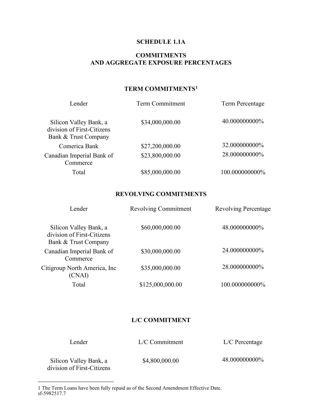 sf-5982517.7 SCHEDULE 1.1A COMMITMENTS AND AGGREGATE EXPOSURE PERCENTAGES TERM COMMITMENTS1 Lender Term Commitment Term Percentage Silicon Valley Bank, a division of First-Citizens Bank & Trust Company $34,000,000.00 40.000000000% Comerica Bank $27,200,000.00 32.000000000% Canadian Imperial Bank of Commerce $23,800,000.00 28.000000000% Total $85,000,000.00 100.000000000% REVOLVING COMMITMENTS Lender Revolving Commitment Revolving Percentage Silicon Valley Bank, a division of First-Citizens Bank & Trust Company $60,000,000.00 48.000000000% Canadian Imperial Bank of Commerce $30,000,000.00 24.000000000% Citigroup North America, Inc (CNAI) $35,000,000.00 28.000000000% Total $125,000,000.00 100.000000000% L/C COMMITMENT Lender L/C Commitment L/C Percentage Silicon Valley Bank, a division of First-Citizens $4,800,000.00 48.000000000% 1 The Term Loans have been fully repaid as of the Second Amendment Effective Date.