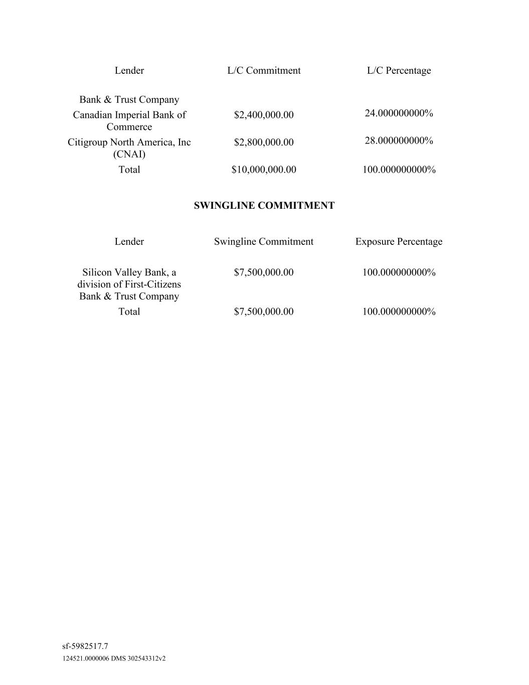 sf-5982517.7 Lender L/C Commitment L/C Percentage Bank & Trust Company Canadian Imperial Bank of Commerce $2,400,000.00 24.000000000% Citigroup North America, Inc (CNAI) $2,800,000.00 28.000000000% Total $10,000,000.00 100.000000000% SWINGLINE COMMITMENT Lender Swingline Commitment Exposure Percentage Silicon Valley Bank, a division of First-Citizens Bank & Trust Company $7,500,000.00 100.000000000% Total $7,500,000.00 100.000000000% 124521.0000006 DMS 302543312v2