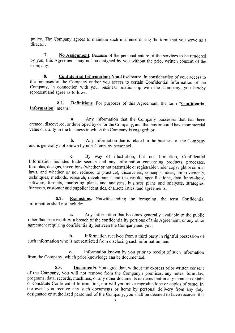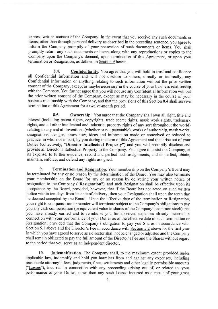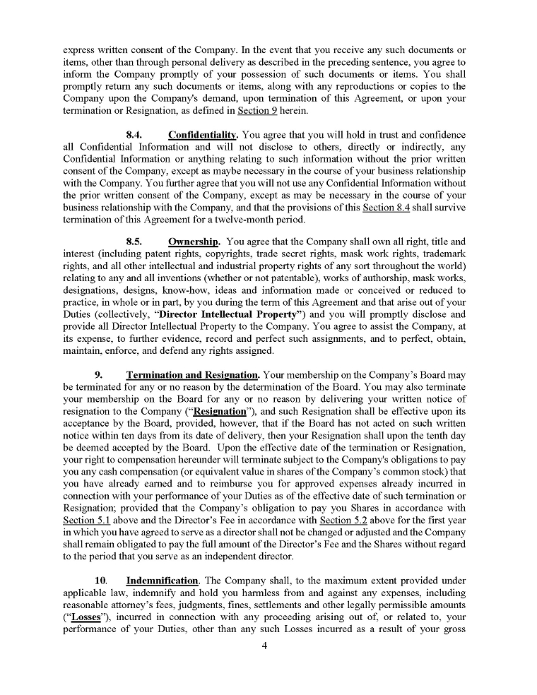 Unless otherwise restricted by the articles of incorporation, bylaws, or an agreement made by the corporation, Section 78.751 of the NRS provides that a corporation may pay expenses as incurred and in advance of the final disposition of the action, suit, or proceeding, upon receipt of an undertaking by or on behalf of the officer or director to repay the amount if it is ultimately determined by a court of competent jurisdiction that such officer or director is not entitled to be indemnified by the company. Section 78.751 of the NRS further permits the corporation to grant its directors and officers additional rights of indemnification under its articles of incorporation, bylaws, or other agreement, including the requirement of mandatory advance payment of expenses.