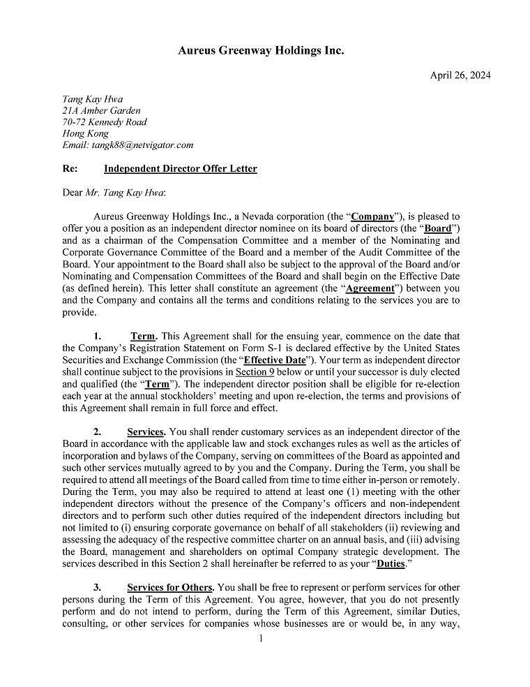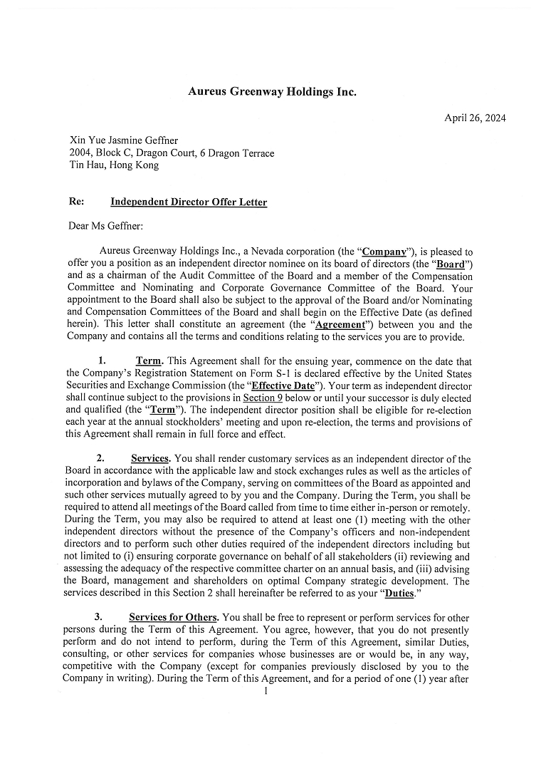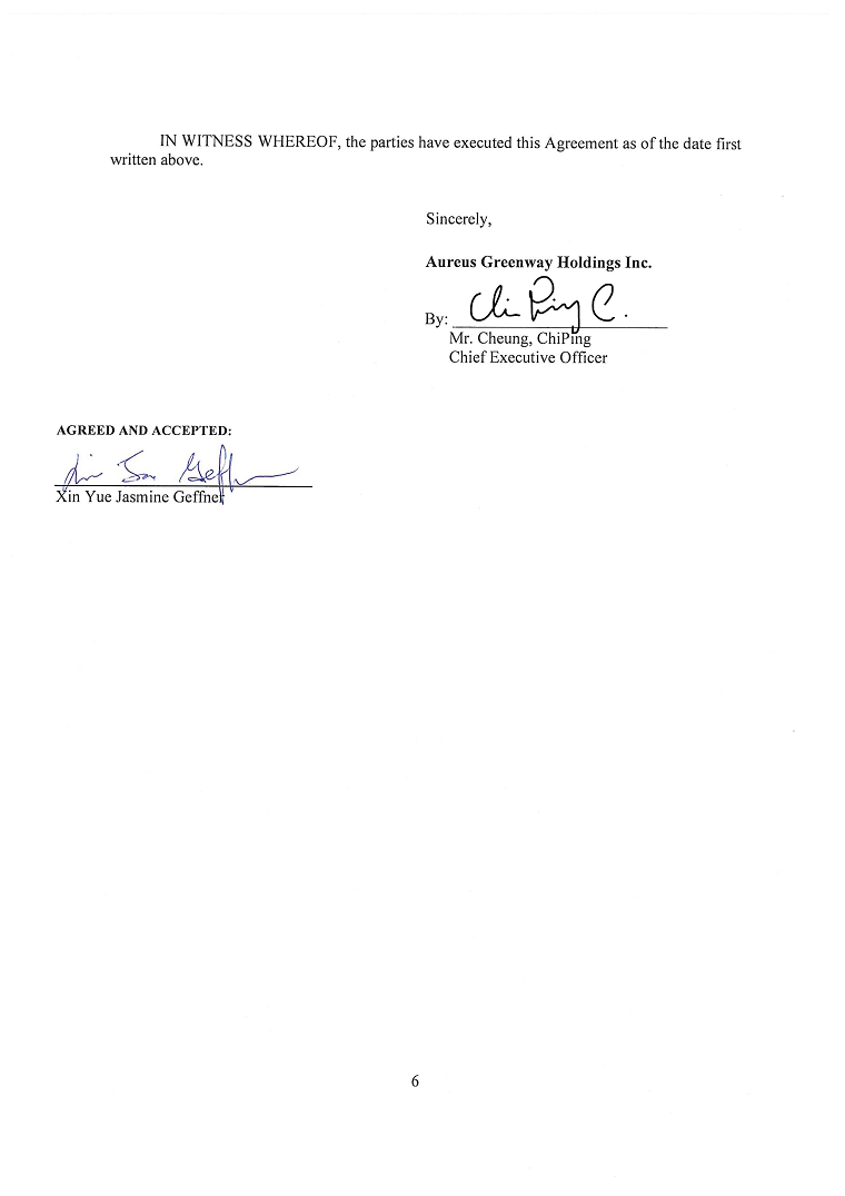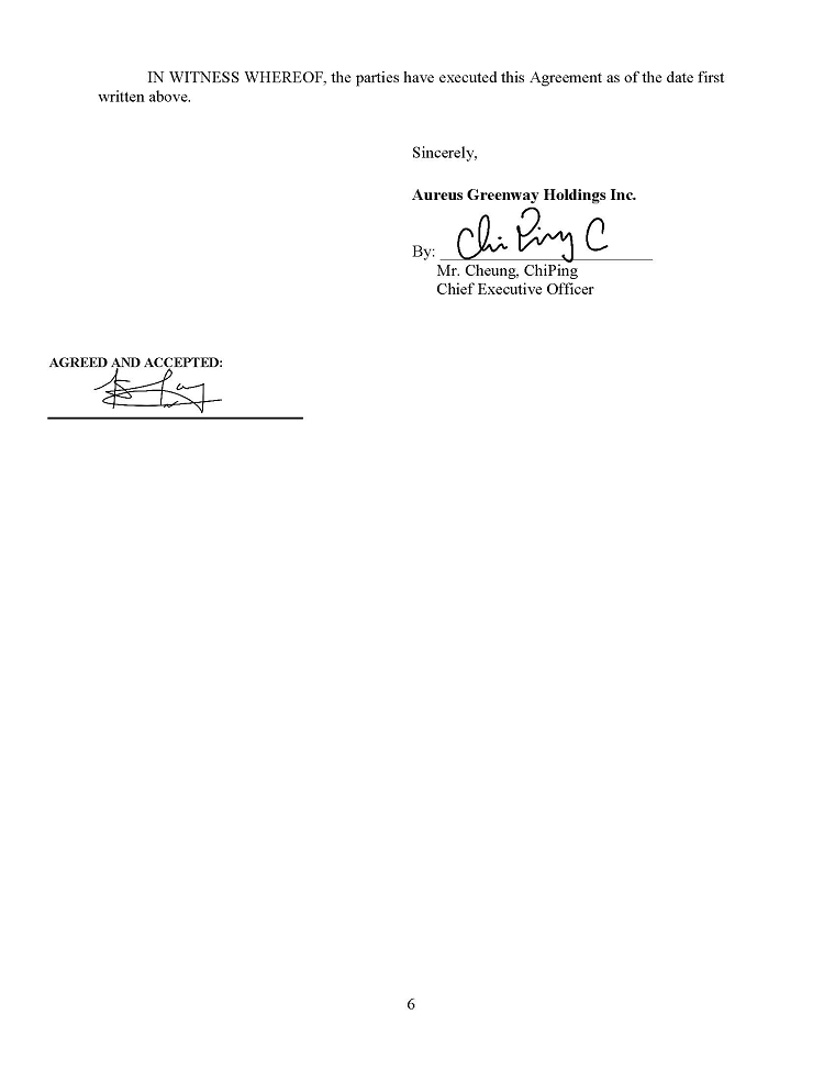 “Aureus Greenway” “our business”, “our Company”, “Company”, “we”, “us”, “our” and “Group” refers to Aureus Greenway Holdings Inc., a corporation incorporated under the laws of the State of Nevada and, unless the context requires otherwise, its subsidiaries;