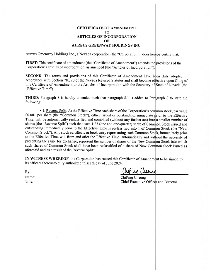 AUREUS GREENWAY HOLDINGS INC.