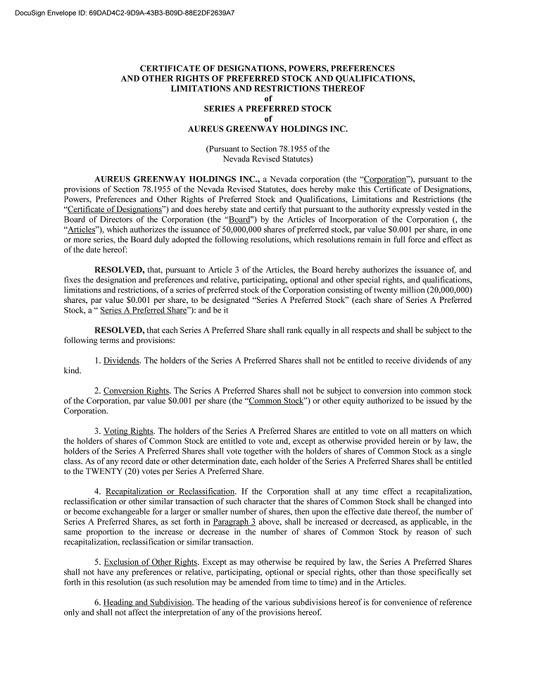 | ● | Aureus Greenway Holdings Inc. was incorporated on December 22, 2023. In connection with the incorporation, on January 17, 2024, we issued (i) a total of 8,160,000 shares of common stock to Ace Champion Investments Limited (as to 6,800,000 shares of common stock), and Trendy View Assets Management (as to 1,360,000 shares of common stock), for total consideration of $8,160, (ii) a total of 10,000,000 shares of our Series A Preferred Stock to Ace Champion Investments Limited (as to 5,000,000 shares of Series A Preferred Stock), Trendy View Assets Management (as to 1,000,000 shares of Series A Preferred Stock), and Chrome Fields Asset Management LLC (as to 5,000,000 shares of Series A Preferred Stock), for total consideration of $10,000, and (iii) 5,440,000 shares of common stock to Chrome Fields Asset Management LLC, in exchange for the right to receive 100 ordinary shares, par value $1.00 of Pine Ridge Group Limited. The transactions were not registered under the Securities Act in reliance on an exemption from registration set forth in Section 4(a)(2) and/or Regulation D and/or Regulation S thereof. |