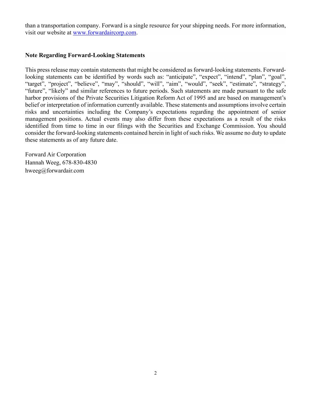 2 than a transportation company. Forward is a single resource for your shipping needs. For more information, visit our website at www.forwardaircorp.com. Note Regarding Forward-Looking Statements This press release may contain statements that might be considered as forward-looking statements. Forward- looking statements can be identified by words such as: “anticipate”, “expect”, “intend”, “plan”, “goal”, “target”, “project”, “believe”, “may”, “should”, “will”, “aim”, “would”, “seek”, “estimate”, “strategy”, “future”, “likely” and similar references to future periods. Such statements are made pursuant to the safe harbor provisions of the Private Securities Litigation Reform Act of 1995 and are based on management’s belief or interpretation of information currently available. These statements and assumptions involve certain risks and uncertainties including the Company’s expectations regarding the appointment of senior management positions. Actual events may also differ from these expectations as a result of the risks identified from time to time in our filings with the Securities and Exchange Commission. You should consider the forward-looking statements contained herein in light of such risks. We assume no duty to update these statements as of any future date. Forward Air Corporation Hannah Weeg, 678-830-4830 hweeg@forwardair.com