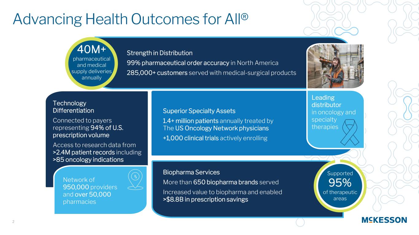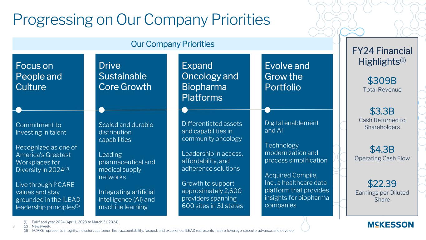 2 Advancing Health Outcomes for All® Strength in Distribution 99% pharmaceutical order accuracy in North America 285,000+ customers served with medical-surgical products Leading distributor in oncology and specialty therapies Technology Differentiation Connected to payers representing 94% of U.S. prescription volume Access to research data from >2.4M patient records including >85 oncology indications Biopharma Services More than 650 biopharma brands served Increased value to biopharma and enabled >$8.8B in prescription savings Network of 950,000 providers and over 50,000 pharmacies Superior Specialty Assets 1.4+ million patients annually treated by The US Oncology Network physicians +1,000 clinical trials actively enrolling Supported 95% of therapeutic areas 40M+ pharmaceutical and medical supply deliveries annually
