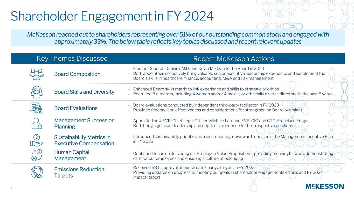 Focus on Good Corporate GovernanceShareholder Engagement in FY 2024 Key Themes Discussed Recent McKesson Actions Board Composition Sustainability Metrics in Executive Compensation Human Capital Management Emissions Reduction Targets Board Skills and Diversity Board Evaluations Management Succession Planning - Elected Deborah Dunsire, M.D. and Kevin M. Ozan to the Board in 2024 - Both appointees collectively bring valuable senior executive leadership experience and supplement the Board’s skills in healthcare, finance, accounting, M&A and risk management - Introduced sustainability priorities as a discretionary, downward modifier in the Management Incentive Plan in FY 2023 - Continued focus on delivering our Employee Value Proposition – providing meaningful work, demonstrating care for our employees and ensuring a culture of belonging - Received SBTi approval of our climate change targets in FY 2023 - Providing updates on progress to meeting our goals in shareholder engagements efforts and FY 2024 Impact Report - Enhanced Board skills matrix to link experience and skills to strategic priorities - Recruited 8 directors, including 4 women and/or 4 racially or ethnically diverse directors, in the past 5 years - Board evaluations conducted by independent third-party facilitator in FY 2023 - Provided feedback on effectiveness and considerations for strengthening Board oversight - Appointed new EVP, Chief Legal Officer, Michele Lau, and EVP, CIO and CTO, Francisco Fraga - Both bring significant leadership and depth of experience to their respective positions McKesson reached out to shareholders representing over 51% of our outstanding common stock and engaged with approximately 33%. The below table reflects key topics discussed and recent relevant updates 4