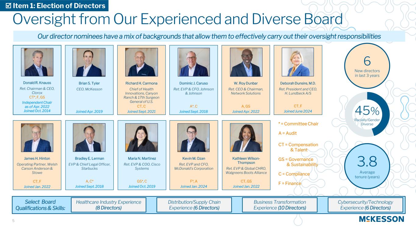 5 Oversight from Our Experienced and Diverse Board Our director nominees have a mix of backgrounds that allow them to effectively carry out their oversight responsibilities * = Committee Chair CT = Compensation & Talent C = Compliance A = Audit GS = Governance & Sustainability F = Finance Brian S. Tyler CEO, McKesson Joined Apr. 2019 Donald R. Knauss Ret. Chairman & CEO, Clorox Independent Chair as of Apr. 2022 Joined Oct. 2014 CT*, F, GS Richard H. Carmona Chief of Health Innovations, Canyon Ranch & 17th Surgeon General of U.S. Joined Sept. 2021 CT, C Dominic J. Caruso Ret. EVP & CFO, Johnson & Johnson Joined Sept. 2018 A*, C James H. Hinton Operating Partner, Welsh Carson Anderson & Stowe Joined Jan. 2022 CT, F W. Roy Dunbar Ret. CEO & Chairman, Network Solutions Joined Apr. 2022 A, GS Bradley E. Lerman EVP & Chief Legal Officer, Starbucks Joined Sept. 2018 A, C* Deborah Dunsire, M.D. Ret. President and CEO, H. Lundbeck A/S Joined June 2024 CT, F Kevin M. Ozan Ret. EVP and CFO, McDonald’s Corporation Joined Jan. 2024 F*, A Kathleen Wilson- Thompson Ret. EVP & Global CHRO, Walgreens Boots Alliance Joined Jan. 2022 CT, GS Maria N. Martinez Ret. EVP & COO, Cisco Systems Joined Oct. 2019 GS*, C 6 New directors in last 3 years 3.8 Average tenure (years) 45% Racially/Gender Diverse Cybersecurity/Technology Experience (6 Directors) Distribution/Supply Chain Experience (6 Directors) Business Transformation Experience (10 Directors) Healthcare Industry Experience (8 Directors) Select Board Qualifications & Skills: 🗹 Item 1: Election of Directors
