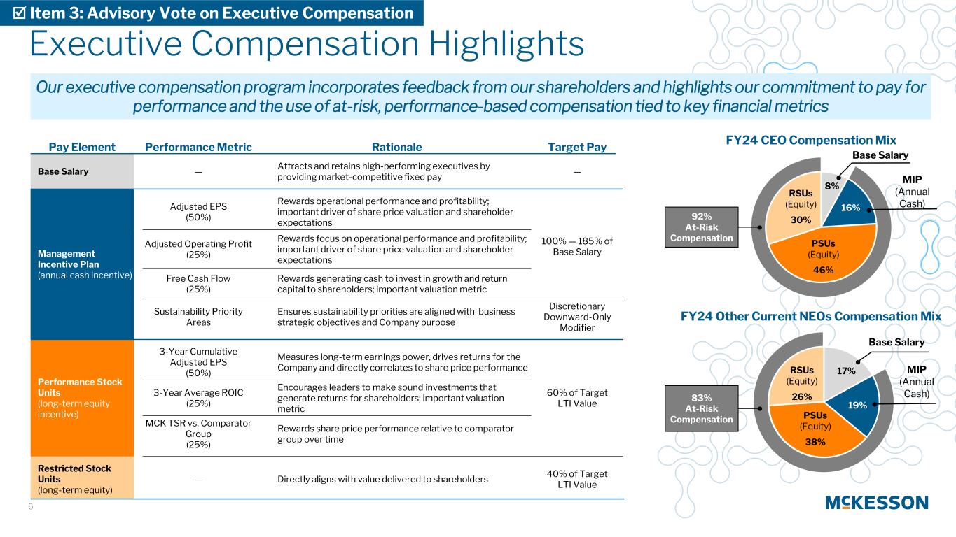 Base Salary MIP (Annual Cash) PSUs (Equity) 46% RSUs (Equity) 30% Base Salary MIP (Annual Cash) PSUs (Equity) 38% RSUs (Equity) 26% 6 Executive Compensation Highlights Our executive compensation program incorporates feedback from our shareholders and highlights our commitment to pay for performance and the use of at-risk, performance-based compensation tied to key financial metrics FY24 CEO Compensation Mix 8% 16% FY24 Other Current NEOs Compensation Mix 92% At-Risk Compensation Pay Element Performance Metric Rationale Target Pay Base Salary — Attracts and retains high-performing executives by providing market-competitive fixed pay — Management Incentive Plan (annual cash incentive) Adjusted EPS (50%) Rewards operational performance and profitability; important driver of share price valuation and shareholder expectations 100% — 185% of Base Salary Adjusted Operating Profit (25%) Rewards focus on operational performance and profitability; important driver of share price valuation and shareholder expectations Free Cash Flow (25%) Rewards generating cash to invest in growth and return capital to shareholders; important valuation metric Sustainability Priority Areas Ensures sustainability priorities are aligned with business strategic objectives and Company purpose Discretionary Downward-Only Modifier Performance Stock Units (long-term equity incentive) 3-Year Cumulative Adjusted EPS (50%) Measures long-term earnings power, drives returns for the Company and directly correlates to share price performance 60% of Target LTI Value 3-Year Average ROIC (25%) Encourages leaders to make sound investments that generate returns for shareholders; important valuation metric MCK TSR vs. Comparator Group (25%) Rewards share price performance relative to comparator group over time Restricted Stock Units (long-term equity) — Directly aligns with value delivered to shareholders 40% of Target LTI Value 17% 19% 83% At-Risk Compensation 🗹 Item 3: Advisory Vote on Executive Compensation