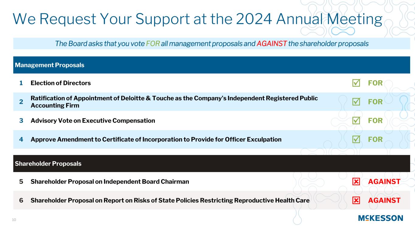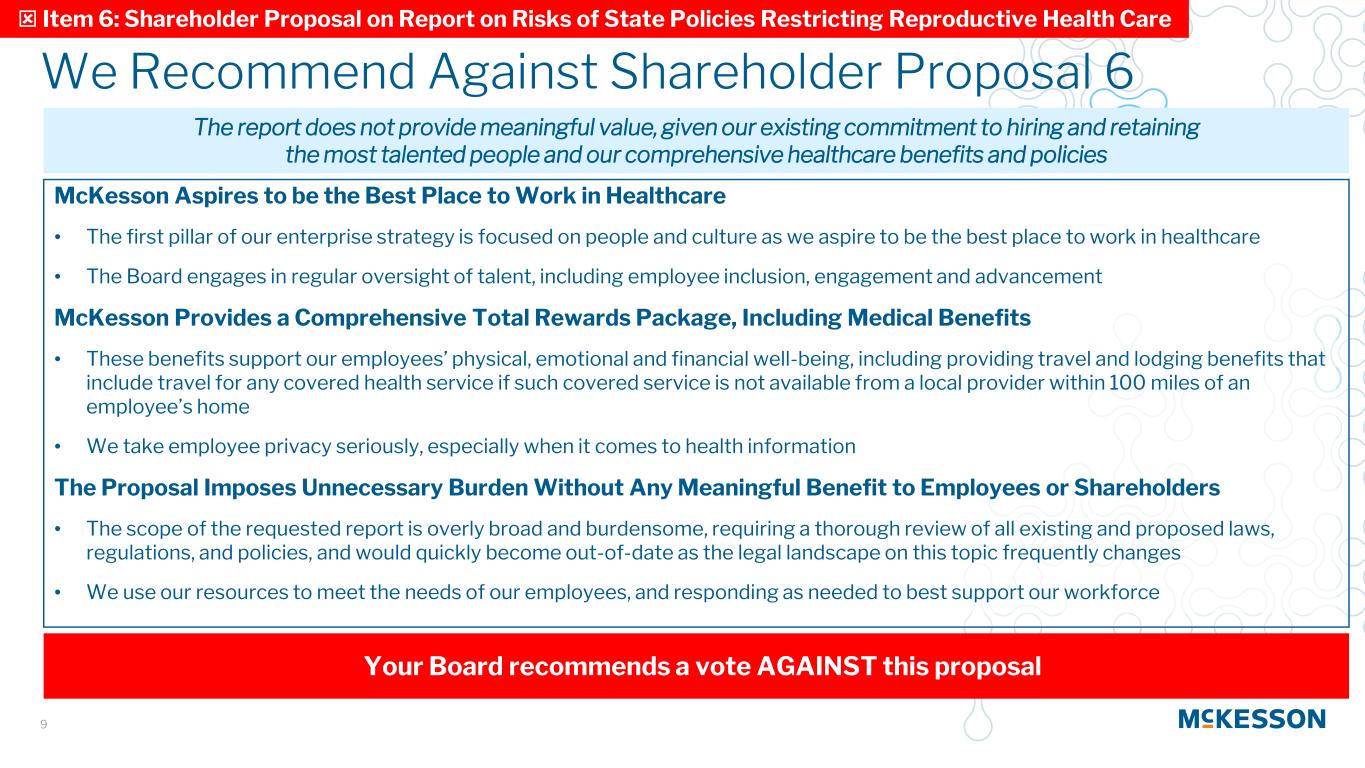 9 The report does not provide meaningful value, given our existing commitment to hiring and retaining the most talented people and our comprehensive healthcare benefits and policies Your Board recommends a vote AGAINST this proposal McKesson Aspires to be the Best Place to Work in Healthcare • The first pillar of our enterprise strategy is focused on people and culture as we aspire to be the best place to work in healthcare • The Board engages in regular oversight of talent, including employee inclusion, engagement and advancement McKesson Provides a Comprehensive Total Rewards Package, Including Medical Benefits • These benefits support our employees’ physical, emotional and financial well-being, including providing travel and lodging benefits that include travel for any covered health service if such covered service is not available from a local provider within 100 miles of an employee’s home • We take employee privacy seriously, especially when it comes to health information The Proposal Imposes Unnecessary Burden Without Any Meaningful Benefit to Employees or Shareholders • The scope of the requested report is overly broad and burdensome, requiring a thorough review of all existing and proposed laws, regulations, and policies, and would quickly become out-of-date as the legal landscape on this topic frequently changes • We use our resources to meet the needs of our employees, and responding as needed to best support our workforce 🗷 Item 6: Shareholder Proposal on Report on Risks of State Policies Restricting Reproductive Health Care We Recommend Against Shareholder Proposal 6