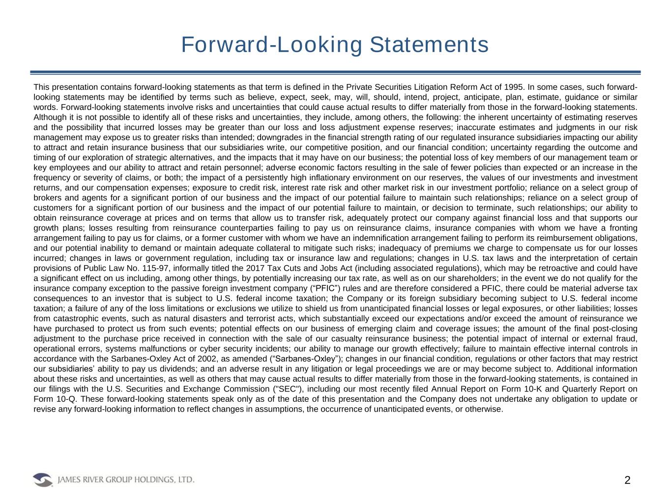 intended; downgrades in the financial strength rating of our regulated insurance subsidiaries impacting our ability to attract and retain insurance business that our subsidiaries write, our competitive position, and our financial condition; uncertainty regarding the outcome and timing of our exploration of strategic alternatives, and the impacts that it may have on our business; the potential loss of key members of our management team or key employees and our ability to attract and retain personnel; adverse economic factors resulting in the sale of fewer policies than expected or an increase in the frequency or severity of claims, or both; the impact of a persistently high inflationary environment on our reserves, the values of our investments and investment returns, and our compensation expenses; exposure to credit risk, interest rate risk and other market risk in our investment portfolio; reliance on a select group of brokers and agents for a significant portion of our business and the impact of our potential failure to maintain such relationships; reliance on a select group of customers for a significant portion of our business and the impact of our potential failure to maintain, or decision to terminate, such relationships; our ability to obtain reinsurance coverage at prices and on terms that allow us to transfer risk, adequately protect our company against financial loss and that supports our growth plans; losses resulting from reinsurance counterparties failing to pay us on reinsurance claims, insurance companies with whom we have a fronting arrangement failing to pay us for claims, or a former customer with whom we have an indemnification arrangement failing to perform its reimbursement obligations, and our potential inability to demand or maintain adequate collateral to mitigate such risks; inadequacy of premiums we charge to compensate us for our losses incurred; changes in laws or government regulation, including tax or insurance law and regulations; changes in U.S. tax laws and the interpretation of certain provisions of Public Law No. 115-97, informally titled the 2017 Tax Cuts and Jobs Act (including associated regulations), which may be retroactive and could have a significant effect on us including, among other things, by potentially increasing our tax rate, as well as on our shareholders; in the event we do not qualify for the insurance company exception to the passive foreign investment company (“PFIC”) rules and are therefore considered a PFIC, there could be material adverse tax consequences to an investor that is subject to U.S. federal income taxation; the Company or its foreign subsidiary becoming subject to U.S. federal income taxation; a failure of any of the loss limitations or exclusions we utilize to shield us from unanticipated financial losses or legal exposures, or other liabilities; losses from catastrophic events, such as natural disasters and terrorist acts, which substantially exceed our expectations and/or exceed the amount of reinsurance we have purchased to protect us from such events; potential effects on our business of emerging claim and coverage issues; the amount of the final post-closing adjustment to the purchase price received in connection with the sale of our casualty reinsurance business; the potential impact of internal or external fraud, operational errors, systems malfunctions or cyber security incidents; our ability to manage our growth effectively; failure to maintain effective internal controls in accordance with the Sarbanes-Oxley Act of 2002, as amended (“Sarbanes-Oxley”); changes in our financial condition, regulations or other factors that may restrict our subsidiaries’ ability to pay us dividends; and an adverse result in any litigation or legal proceedings we are or may become subject to. Additional information about these risks and uncertainties, as well as others that may cause actual results to differ materially from those in the forward-looking statements, is contained in our filings with the U.S. Securities and Exchange Commission (“SEC”), including our most recently filed Annual Report on Form 10-K and Quarterly Report on Form 10-Q. These forward-looking statements speak only as of the date of this release and the Company does not undertake any obligation to update or revise any forward-looking information to reflect changes in assumptions, the occurrence of unanticipated events, or otherwise.