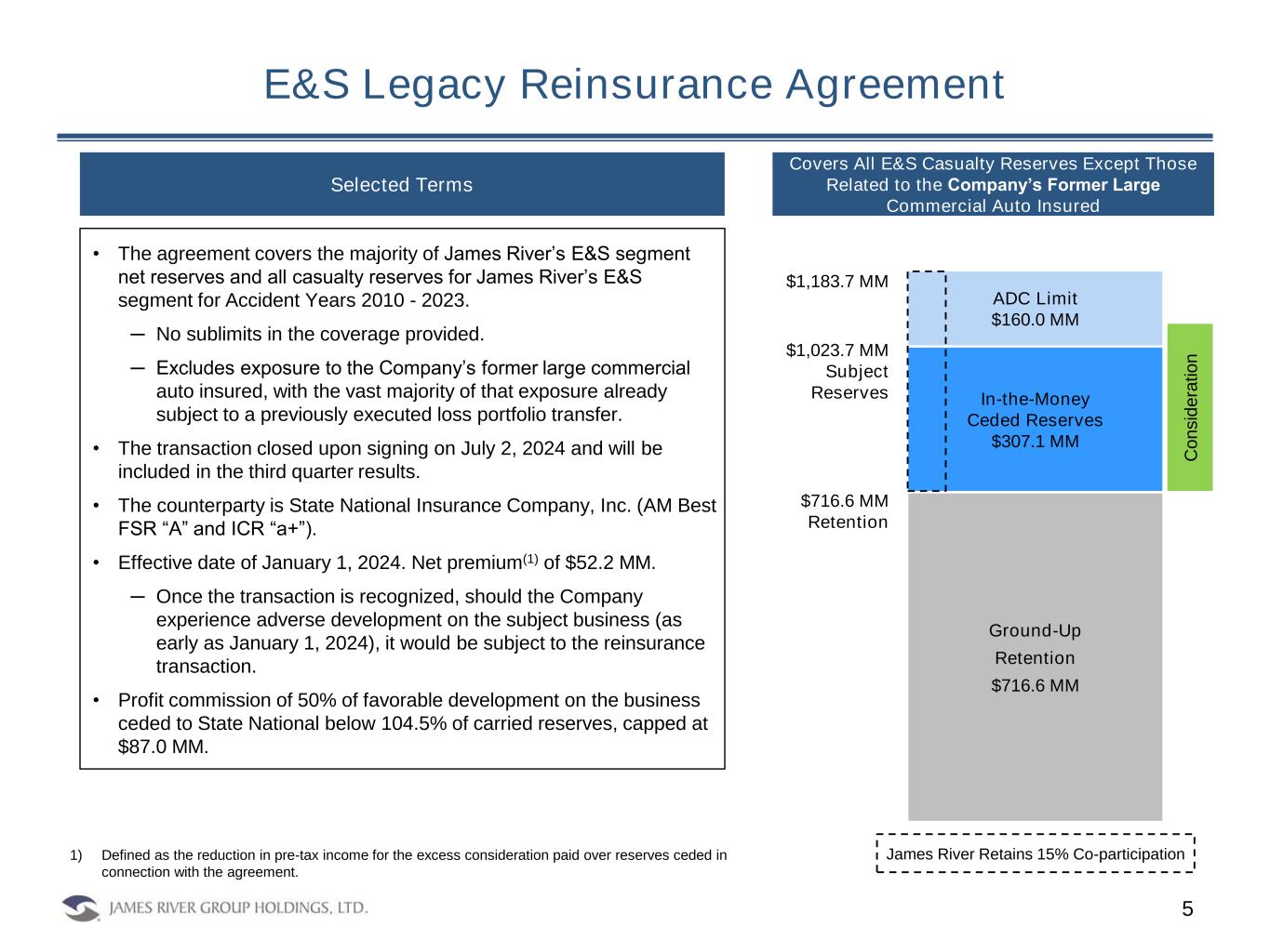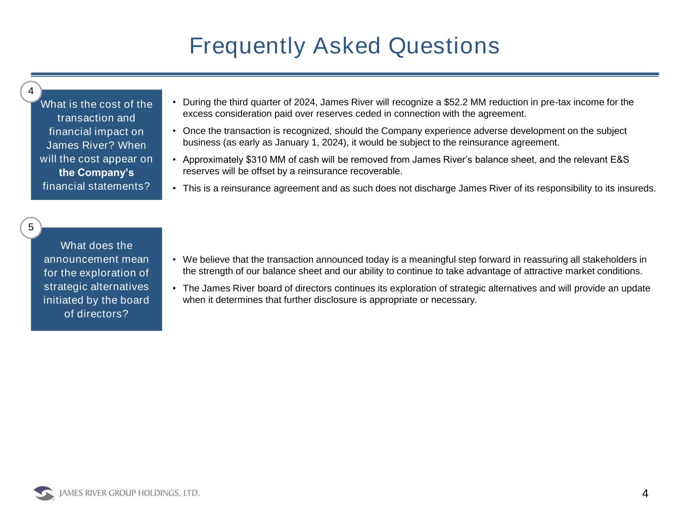 Frequently Asked Questions 3 • Subsidiaries of James River Group Holdings, Ltd. (“James River” or the “Company”) have signed and closed a combined loss portfolio transfer and adverse development cover (“ADC”) reinsurance agreement for all Excess and Surplus Lines (“E&S”) segment casualty reserves for the subject accident years, excluding exposure to the Company’s former large commercial auto insured (with the vast majority of that exposure already subject to a previously executed loss portfolio transfer). • State National Insurance Company, Inc. (“SNIC”), a highly rated company (AM Best FSR “A” and ICR “a+”), is the counterparty reinsurer. • James River will retain all claims handling responsibilities on this portfolio. What does today’s announcement mean? Why did James River enter into a legacy reinsurance agreement for its E&S segment? • The transaction provides several benefits to the Company, including: 1) Meaningful reserve protection, incepting at our carried reserves; 2) Providing a higher level of certainty for our stakeholders; and 3) Capital relief to support the profitable growth of James River’s E&S segment. • Under the terms of the agreement, James River is purchasing $160.0 MM of ADC limit with a 15% co- participation for net premium(1) of $52.2 MM (pre-tax). The reinsurance agreement was executed on July 2, 2024 and is effective January 1, 2024. • The subject business is E&S segment business written by the two operating companies exclusively supporting the segment, James River Insurance Company and James River Casualty Company. It covers all casualty business for accident years 2010-2023 (both years inclusive), excluding exposure to the Company’s former large commercial auto insured. • James River is also ceding $307.1 MM of existing reserves with a 15% co-participation. How much reinsurance coverage is James River purchasing? What accident years are included? 1 2 3 1) Defined as the reduction in pre-tax income for the excess consideration paid over reserves ceded in connection with the agreement.
