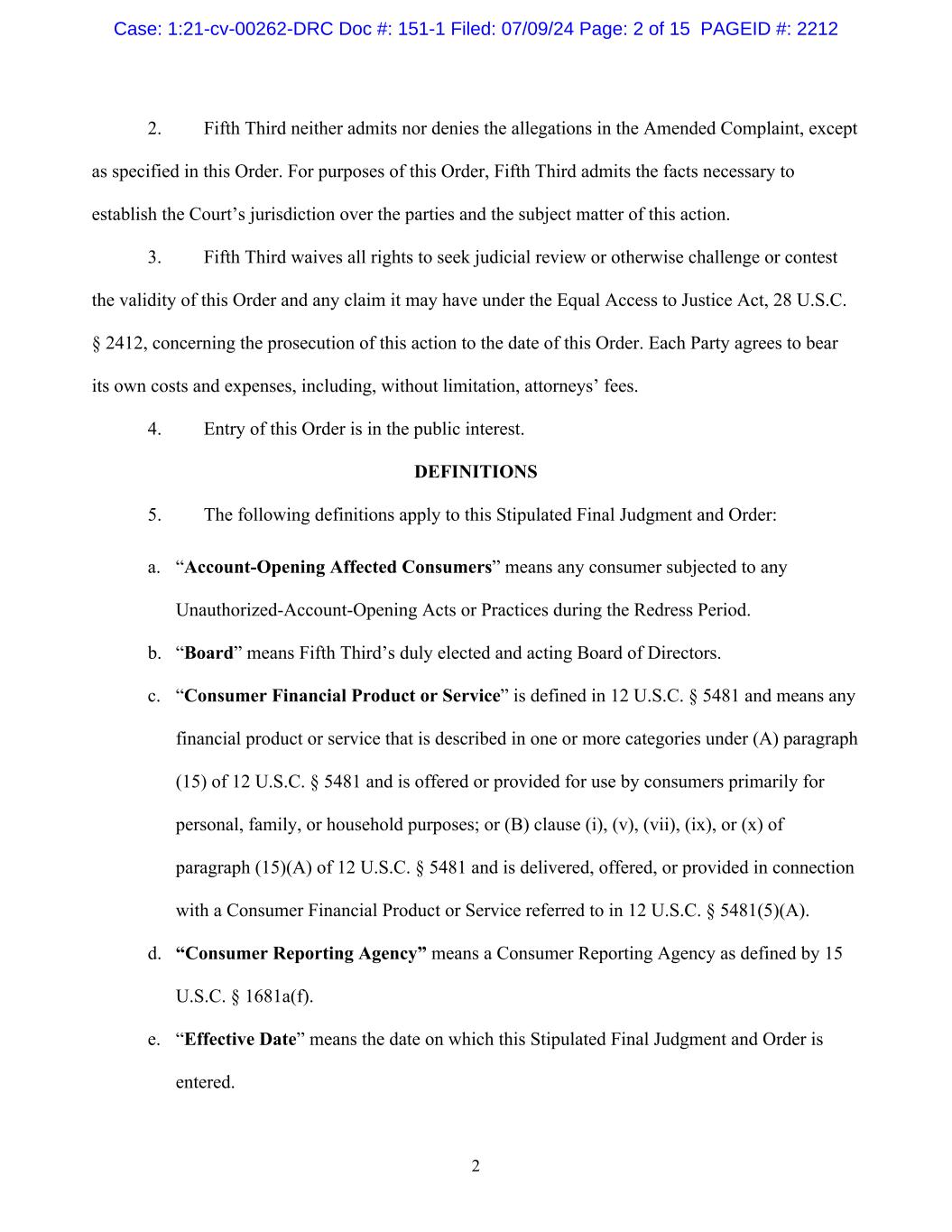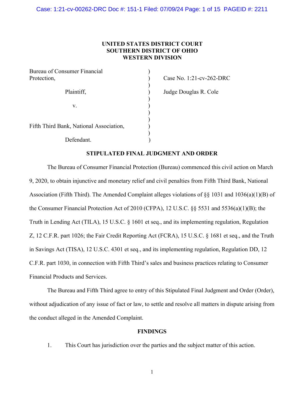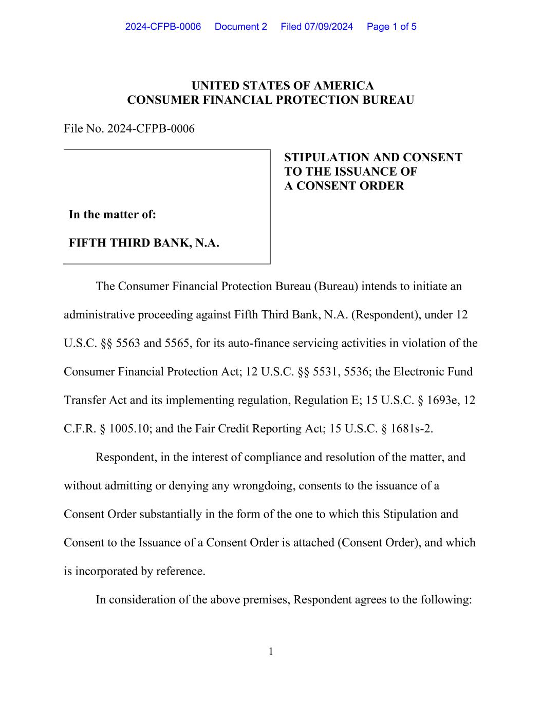 1 UNITED STATES OF AMERICA CONSUMER FINANCIAL PROTECTION BUREAU File No. 2024-CFPB-0006 STIPULATION AND CONSENT TO THE ISSUANCE OF A CONSENT ORDER In the matter of: FIFTH THIRD BANK, N.A. The Consumer Financial Protection Bureau (Bureau) intends to initiate an administrative proceeding against Fifth Third Bank, N.A. (Respondent), under 12 U.S.C. §§ 5563 and 5565, for its auto-finance servicing activities in violation of the Consumer Financial Protection Act; 12 U.S.C. §§ 5531, 5536; the Electronic Fund Transfer Act and its implementing regulation, Regulation E; 15 U.S.C. § 1693e, 12 C.F.R. § 1005.10; and the Fair Credit Reporting Act; 15 U.S.C. § 1681s-2. Respondent, in the interest of compliance and resolution of the matter, and without admitting or denying any wrongdoing, consents to the issuance of a Consent Order substantially in the form of the one to which this Stipulation and Consent to the Issuance of a Consent Order is attached (Consent Order), and which is incorporated by reference. In consideration of the above premises, Respondent agrees to the following: 2024-CFPB-0006 Document 2 Filed 07/09/2024 Page 1 of 5