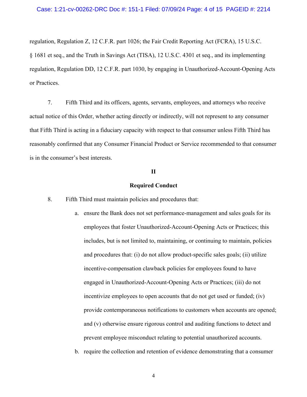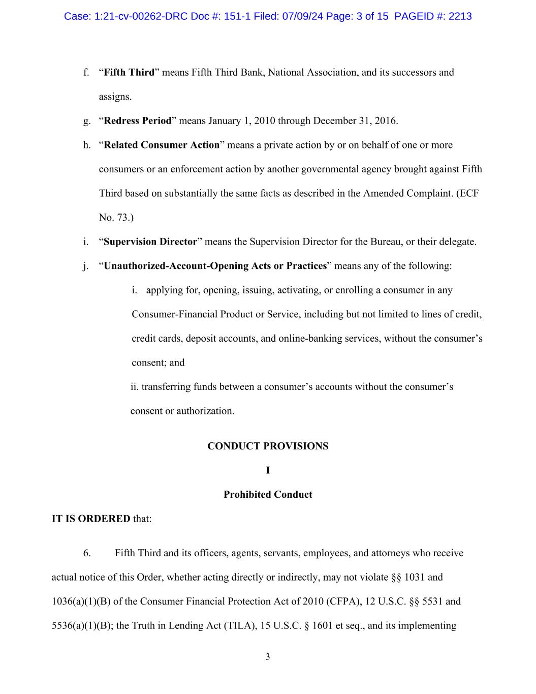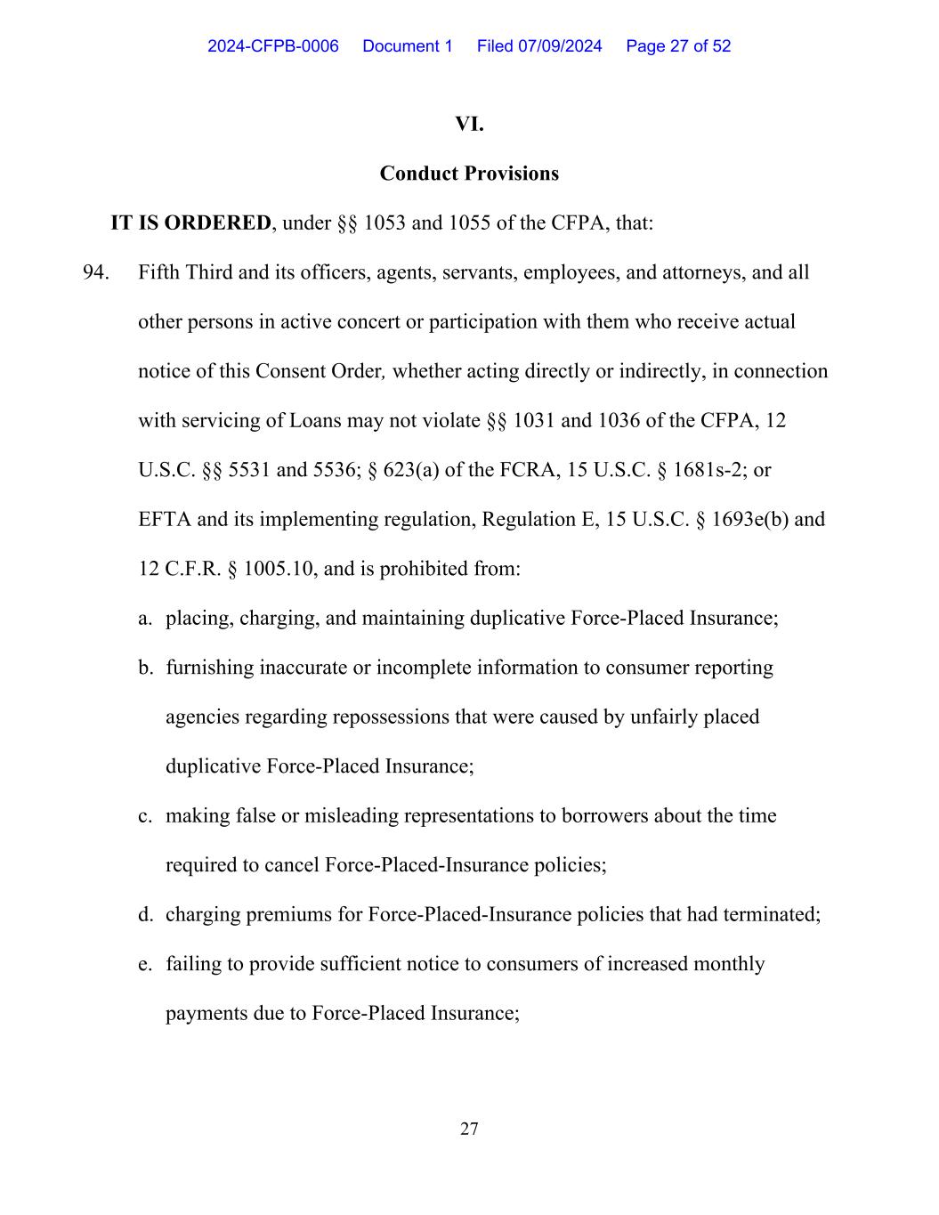 27 VI. Conduct Provisions IT IS ORDERED, under §§ 1053 and 1055 of the CFPA, that: 94. Fifth Third and its officers, agents, servants, employees, and attorneys, and all other persons in active concert or participation with them who receive actual notice of this Consent Order, whether acting directly or indirectly, in connection with servicing of Loans may not violate §§ 1031 and 1036 of the CFPA, 12 U.S.C. §§ 5531 and 5536; § 623(a) of the FCRA, 15 U.S.C. § 1681s-2; or EFTA and its implementing regulation, Regulation E, 15 U.S.C. § 1693e(b) and 12 C.F.R. § 1005.10, and is prohibited from: a. placing, charging, and maintaining duplicative Force-Placed Insurance; b. furnishing inaccurate or incomplete information to consumer reporting agencies regarding repossessions that were caused by unfairly placed duplicative Force-Placed Insurance; c. making false or misleading representations to borrowers about the time required to cancel Force-Placed-Insurance policies; d. charging premiums for Force-Placed-Insurance policies that had terminated; e. failing to provide sufficient notice to consumers of increased monthly payments due to Force-Placed Insurance; 2024-CFPB-0006 Document 1 Filed 07/09/2024 Page 27 of 52