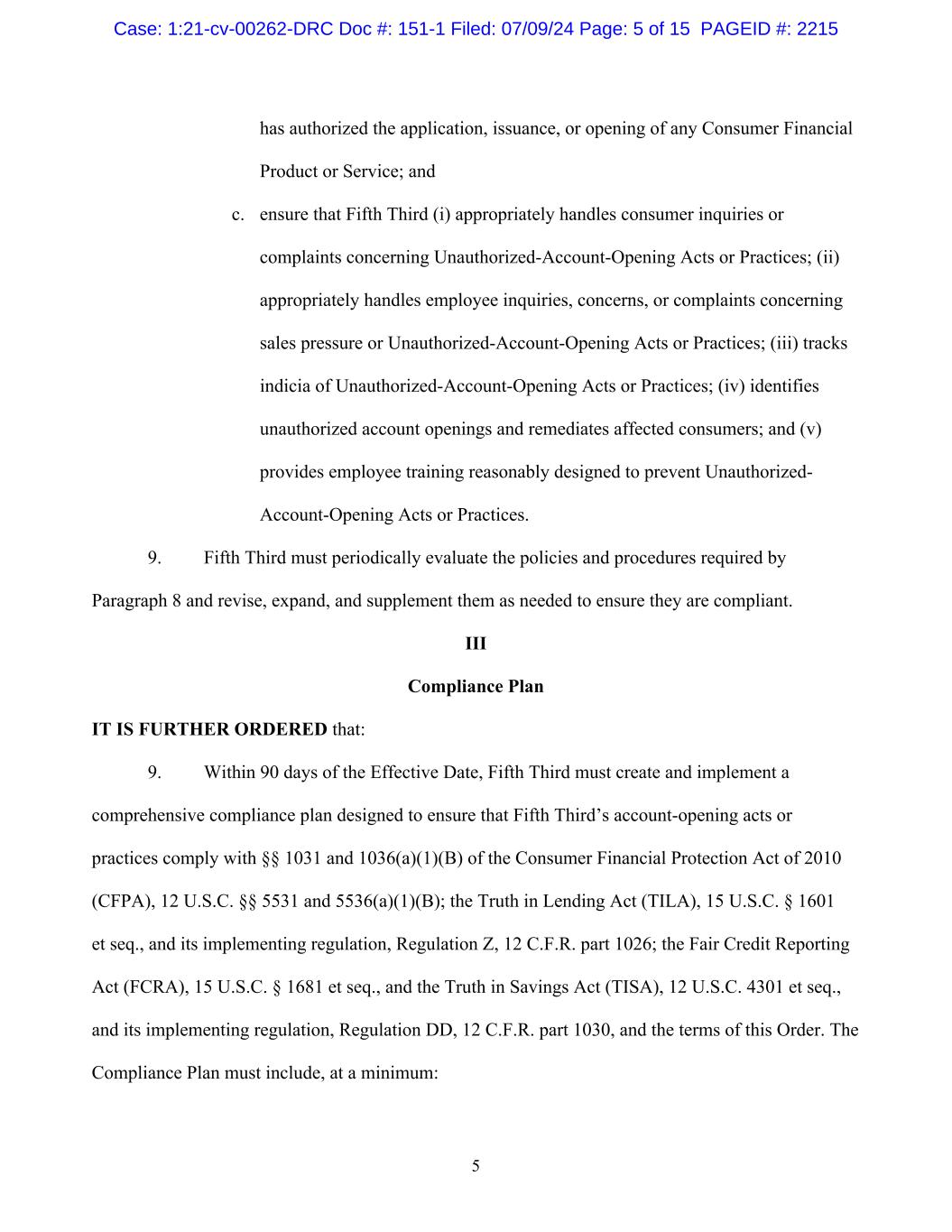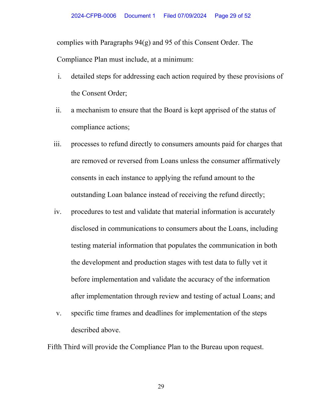 29 complies with Paragraphs 94(g) and 95 of this Consent Order. The Compliance Plan must include, at a minimum: i. detailed steps for addressing each action required by these provisions of the Consent Order; ii. a mechanism to ensure that the Board is kept apprised of the status of compliance actions; iii. processes to refund directly to consumers amounts paid for charges that are removed or reversed from Loans unless the consumer affirmatively consents in each instance to applying the refund amount to the outstanding Loan balance instead of receiving the refund directly; iv. procedures to test and validate that material information is accurately disclosed in communications to consumers about the Loans, including testing material information that populates the communication in both the development and production stages with test data to fully vet it before implementation and validate the accuracy of the information after implementation through review and testing of actual Loans; and v. specific time frames and deadlines for implementation of the steps described above. Fifth Third will provide the Compliance Plan to the Bureau upon request. 2024-CFPB-0006 Document 1 Filed 07/09/2024 Page 29 of 52