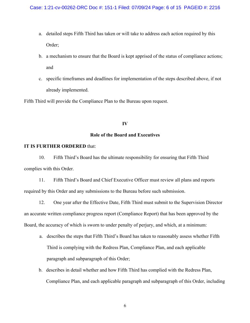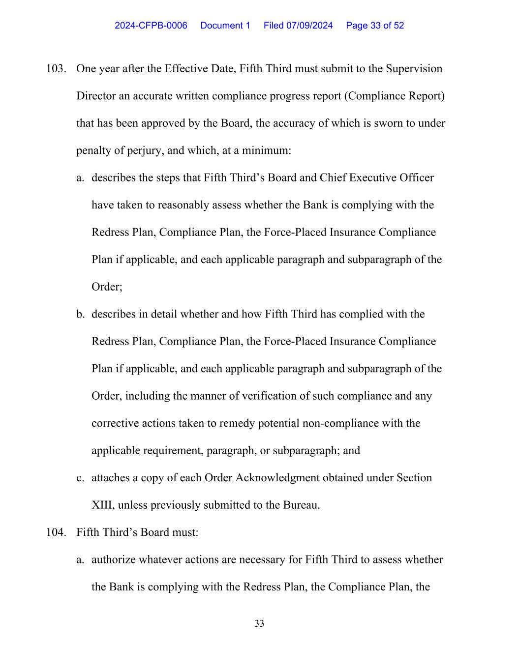 33 103. One year after the Effective Date, Fifth Third must submit to the Supervision Director an accurate written compliance progress report (Compliance Report) that has been approved by the Board, the accuracy of which is sworn to under penalty of perjury, and which, at a minimum: a. describes the steps that Fifth Third’s Board and Chief Executive Officer have taken to reasonably assess whether the Bank is complying with the Redress Plan, Compliance Plan, the Force-Placed Insurance Compliance Plan if applicable, and each applicable paragraph and subparagraph of the Order; b. describes in detail whether and how Fifth Third has complied with the Redress Plan, Compliance Plan, the Force-Placed Insurance Compliance Plan if applicable, and each applicable paragraph and subparagraph of the Order, including the manner of verification of such compliance and any corrective actions taken to remedy potential non-compliance with the applicable requirement, paragraph, or subparagraph; and c. attaches a copy of each Order Acknowledgment obtained under Section XIII, unless previously submitted to the Bureau. 104. Fifth Third’s Board must: a. authorize whatever actions are necessary for Fifth Third to assess whether the Bank is complying with the Redress Plan, the Compliance Plan, the 2024-CFPB-0006 Document 1 Filed 07/09/2024 Page 33 of 52