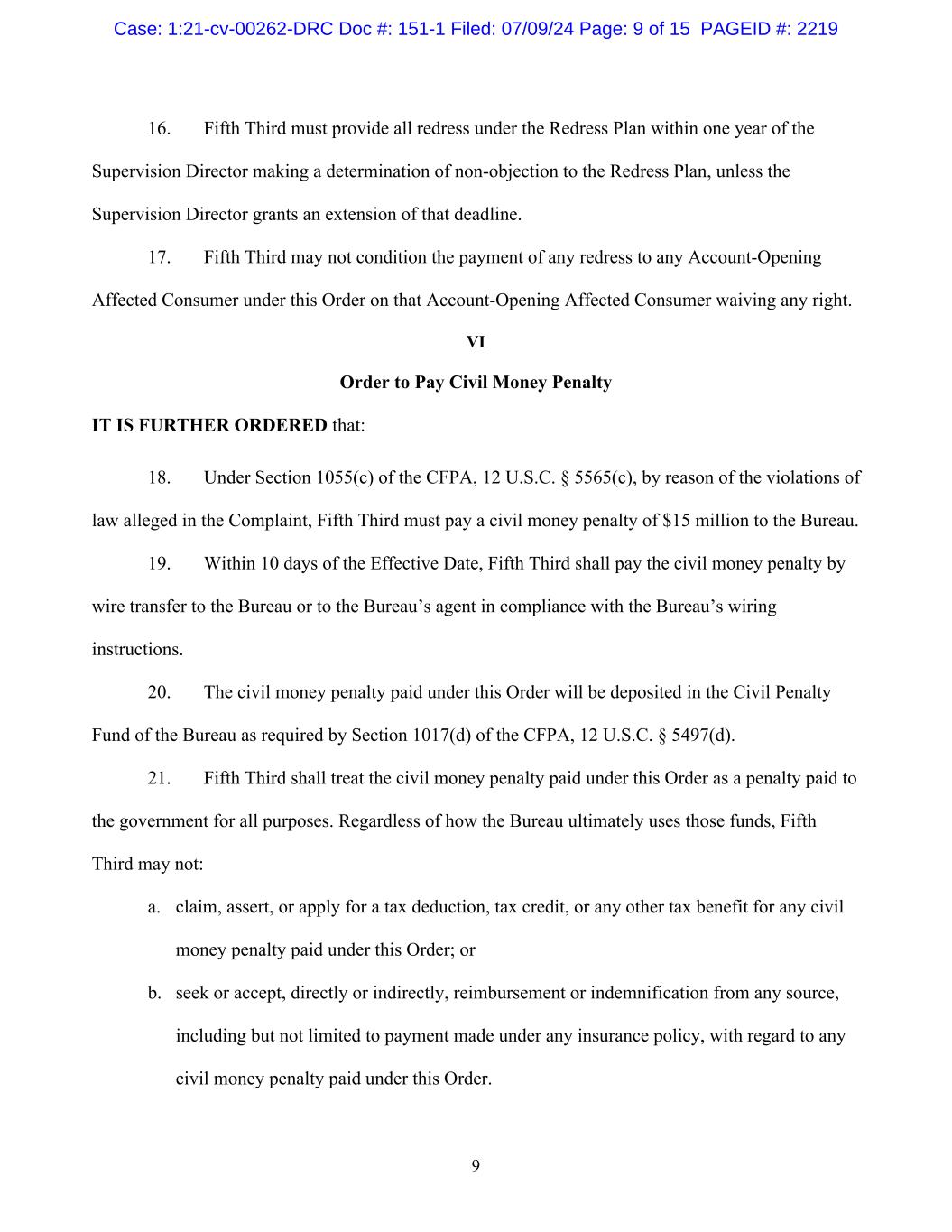 41 have no right to challenge any actions that the Bureau or its representatives take under this Section. 113. The Bank may not condition the payment of any redress to any Affected Consumer under this Consent Order on that Affected Consumer waiving any right. X. Order to Pay Civil Money Penalty IT IS FURTHER ORDERED that: 114. Under § 1055(c) of the CFPA, 12 U.S.C. § 5565(c), by reason of the violations of law described in Section V of this Consent Order, Fifth Third must pay a civil money penalty of $5 million to the Bureau. 115. Within 10 days of the Effective Date, Respondent must pay the civil money penalty by wire transfer to the Bureau or to the Bureau’s agent in compliance with the Bureau’s wiring instructions. 116. The civil money penalty paid under this Consent Order will be deposited in the Civil Penalty Fund of the Bureau as required by § 1017(d) of the CFPA, 12 U.S.C. § 5497(d). 117. Respondent, for all purposes, must treat the civil money penalty paid under this Consent Order as a penalty paid to the government. Regardless of how the Bureau ultimately uses those funds, the Bank may not: 2024-CFPB-0006 Document 1 Filed 07/09/2024 Page 41 of 52