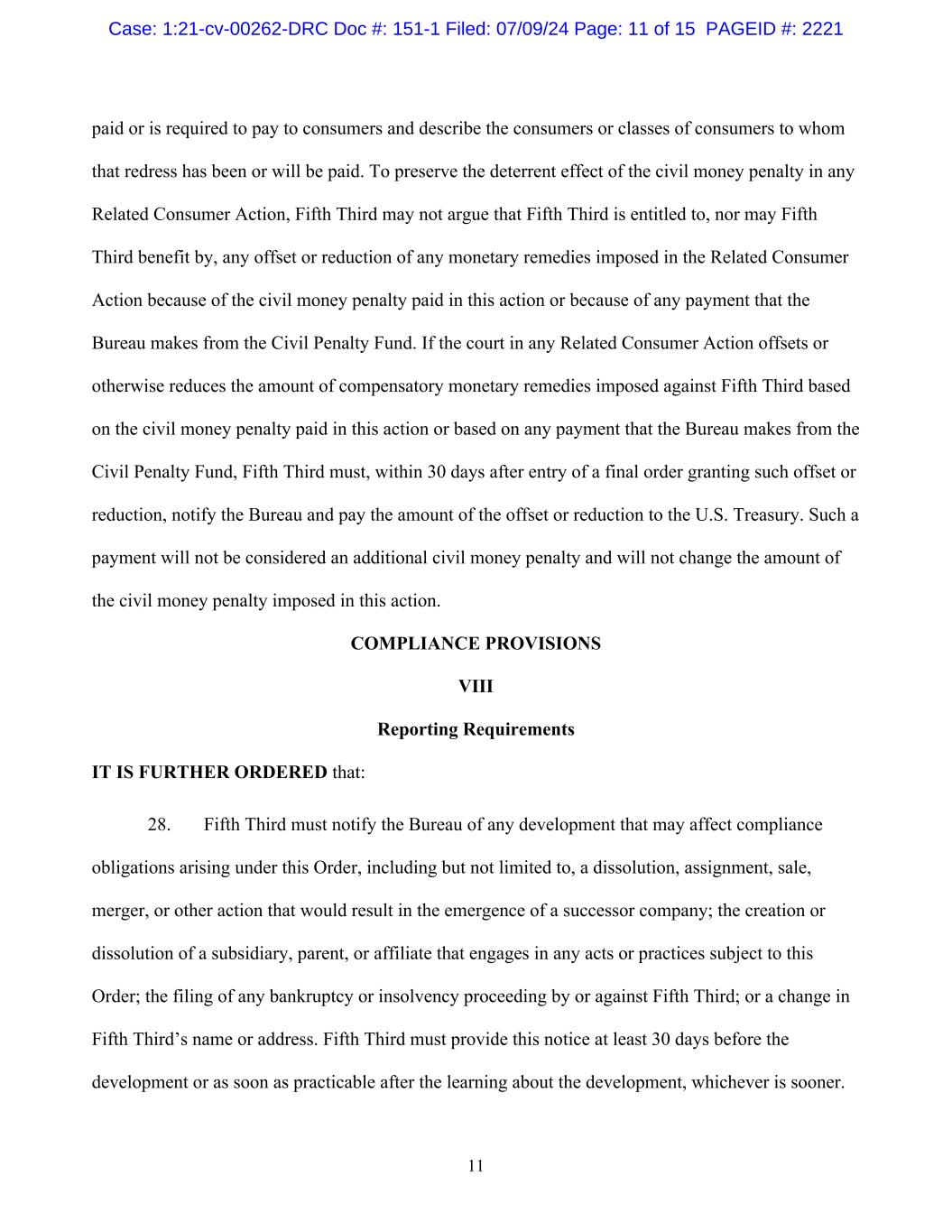 42 a. claim, assert, or apply for a tax deduction, tax credit, or any other tax benefit for any civil money penalty paid under this Consent Order; or b. seek or accept, directly or indirectly, reimbursement or indemnification from any source, including but not limited to payment made under any insurance policy, with regard to any civil money penalty paid under this Consent Order. 118. To preserve the deterrent effect of the civil money penalty in any Related Consumer Action, Fifth Third may not argue that the Bank is entitled to, nor may it benefit by, any offset or reduction of any compensatory monetary remedies imposed in the Related Consumer Action because of the civil money penalty paid in this action or because of any payment that the Bureau makes from the Civil Penalty Fund. If the court in any Related Consumer Action offsets or otherwise reduces the amount of compensatory monetary remedies imposed against Respondent based on the civil money penalty paid in this action or based on any payment that the Bureau makes from the Civil Penalty Fund, Respondent must, within 30 days after entry of a final order granting such offset or reduction, notify the Bureau, and pay the amount of the offset or reduction to the U.S. Treasury. Such a payment will not be considered an additional civil money penalty and will not change the amount of the civil money penalty imposed in this action. 2024-CFPB-0006 Document 1 Filed 07/09/2024 Page 42 of 52