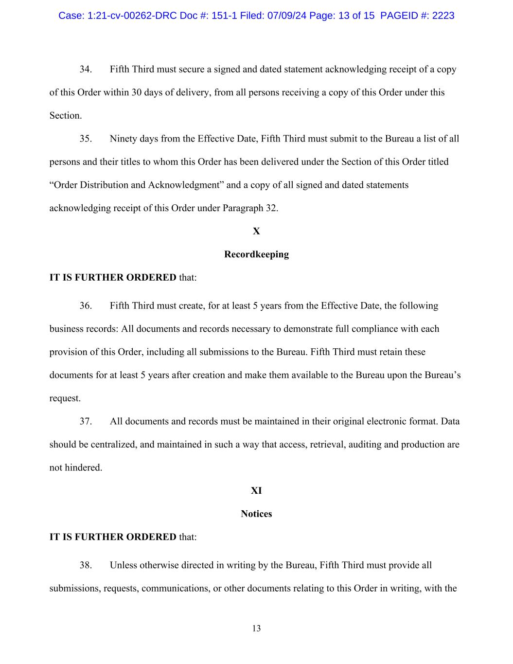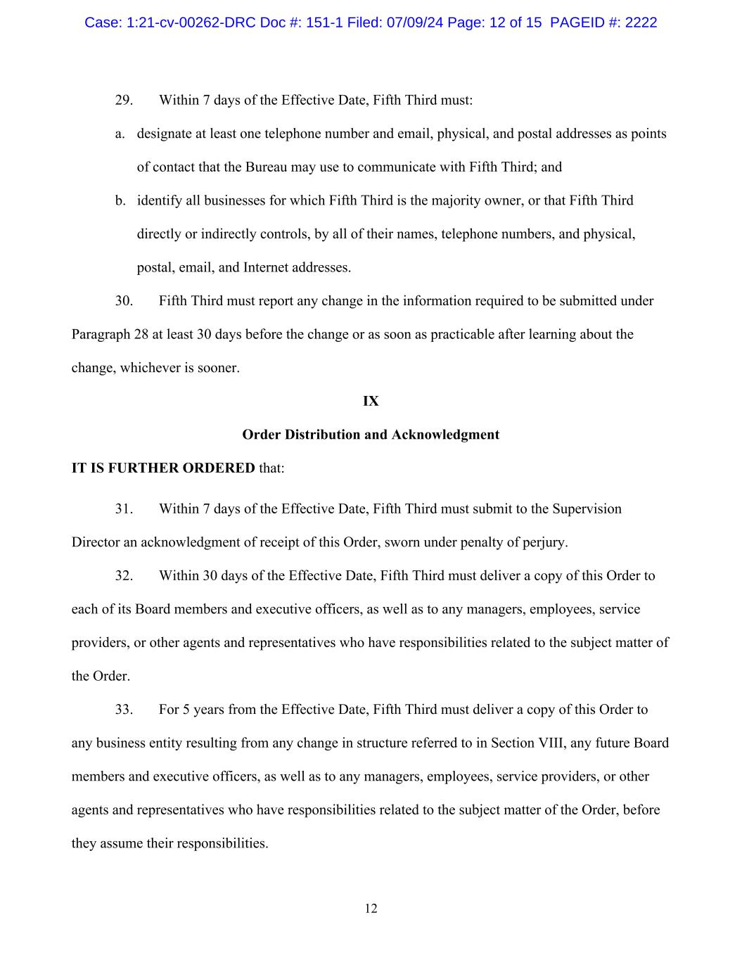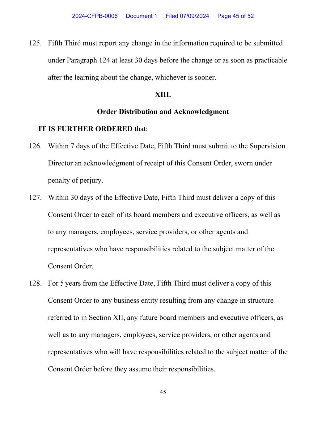 45 125. Fifth Third must report any change in the information required to be submitted under Paragraph 124 at least 30 days before the change or as soon as practicable after the learning about the change, whichever is sooner. XIII. Order Distribution and Acknowledgment IT IS FURTHER ORDERED that: 126. Within 7 days of the Effective Date, Fifth Third must submit to the Supervision Director an acknowledgment of receipt of this Consent Order, sworn under penalty of perjury. 127. Within 30 days of the Effective Date, Fifth Third must deliver a copy of this Consent Order to each of its board members and executive officers, as well as to any managers, employees, service providers, or other agents and representatives who have responsibilities related to the subject matter of the Consent Order. 128. For 5 years from the Effective Date, Fifth Third must deliver a copy of this Consent Order to any business entity resulting from any change in structure referred to in Section XII, any future board members and executive officers, as well as to any managers, employees, service providers, or other agents and representatives who will have responsibilities related to the subject matter of the Consent Order before they assume their responsibilities. 2024-CFPB-0006 Document 1 Filed 07/09/2024 Page 45 of 52