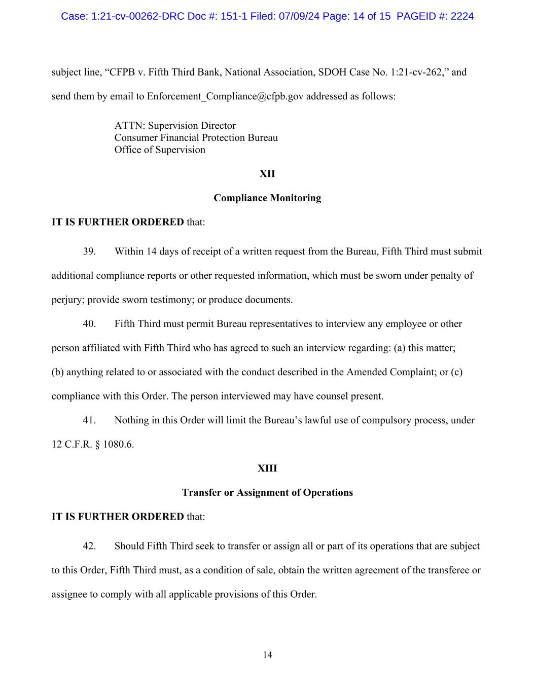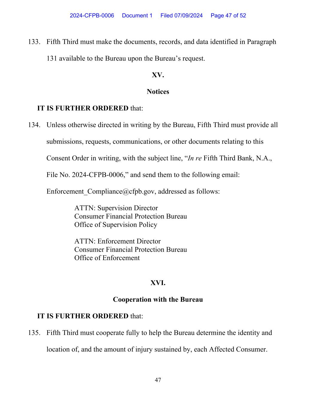 47 133. Fifth Third must make the documents, records, and data identified in Paragraph 131 available to the Bureau upon the Bureau’s request. XV. Notices IT IS FURTHER ORDERED that: 134. Unless otherwise directed in writing by the Bureau, Fifth Third must provide all submissions, requests, communications, or other documents relating to this Consent Order in writing, with the subject line, “In re Fifth Third Bank, N.A., File No. 2024-CFPB-0006,” and send them to the following email: Enforcement_Compliance@cfpb.gov, addressed as follows: ATTN: Supervision Director Consumer Financial Protection Bureau Office of Supervision Policy ATTN: Enforcement Director Consumer Financial Protection Bureau Office of Enforcement XVI. Cooperation with the Bureau IT IS FURTHER ORDERED that: 135. Fifth Third must cooperate fully to help the Bureau determine the identity and location of, and the amount of injury sustained by, each Affected Consumer. 2024-CFPB-0006 Document 1 Filed 07/09/2024 Page 47 of 52