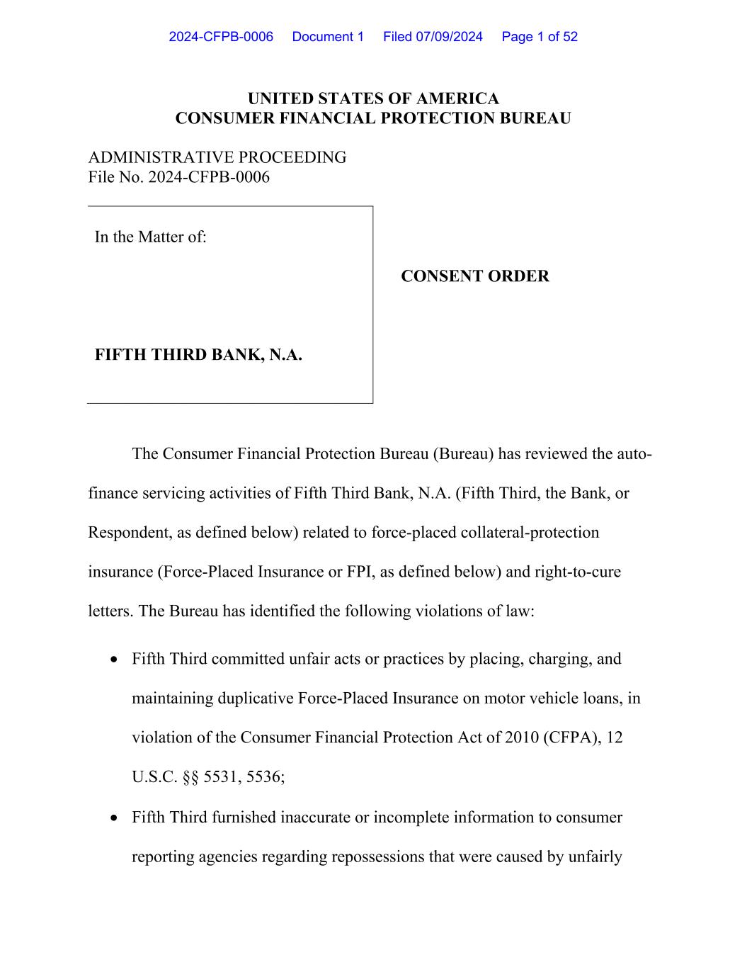 UNITED STATES OF AMERICA CONSUMER FINANCIAL PROTECTION BUREAU ADMINISTRATIVE PROCEEDING File No. 2024-CFPB-0006 In the Matter of: CONSENT ORDER FIFTH THIRD BANK, N.A. The Consumer Financial Protection Bureau (Bureau) has reviewed the auto- finance servicing activities of Fifth Third Bank, N.A. (Fifth Third, the Bank, or Respondent, as defined below) related to force-placed collateral-protection insurance (Force-Placed Insurance or FPI, as defined below) and right-to-cure letters. The Bureau has identified the following violations of law: Fifth Third committed unfair acts or practices by placing, charging, and maintaining duplicative Force-Placed Insurance on motor vehicle loans, in violation of the Consumer Financial Protection Act of 2010 (CFPA), 12 U.S.C. §§ 5531, 5536; Fifth Third furnished inaccurate or incomplete information to consumer reporting agencies regarding repossessions that were caused by unfairly 2024-CFPB-0006 Document 1 Filed 07/09/2024 Page 1 of 52