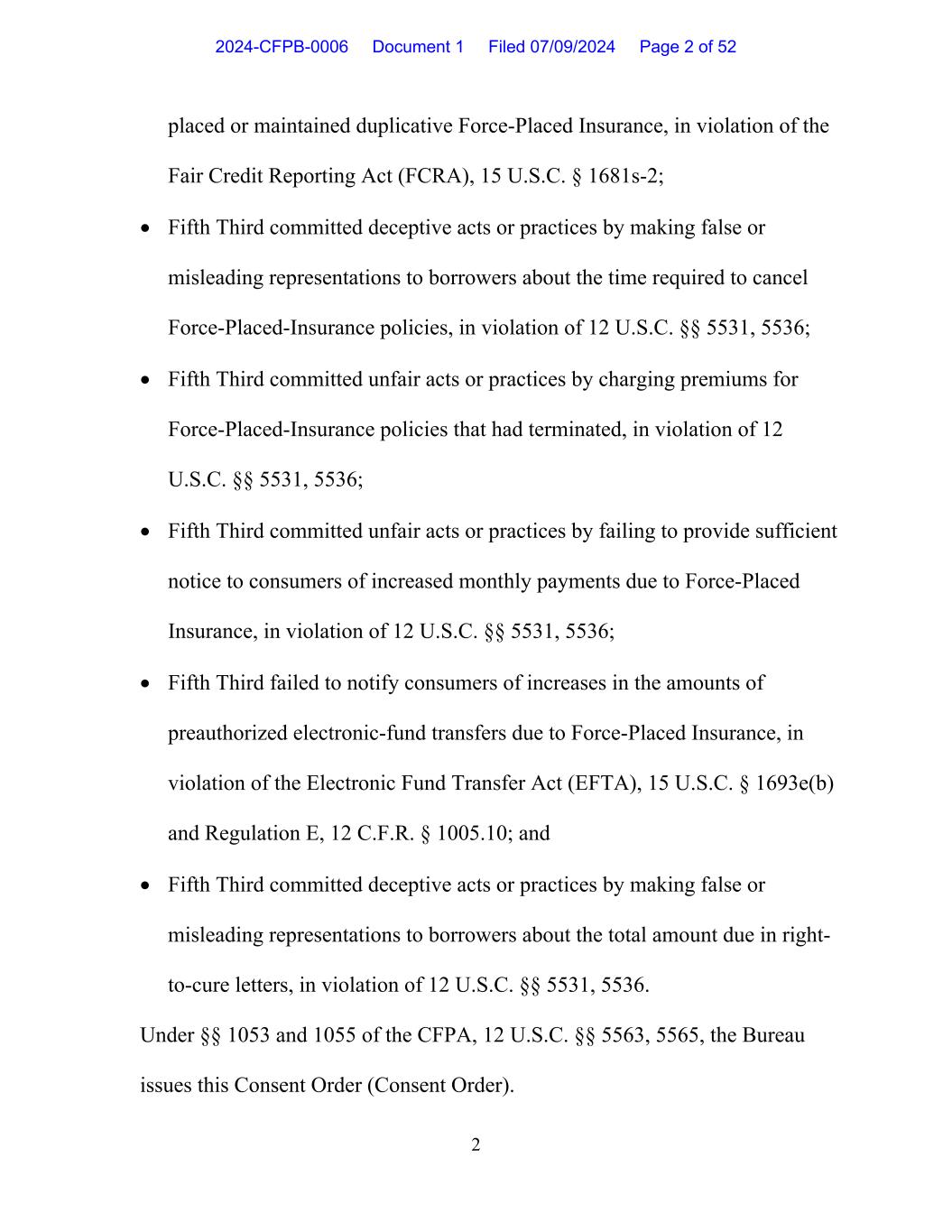 2 placed or maintained duplicative Force-Placed Insurance, in violation of the Fair Credit Reporting Act (FCRA), 15 U.S.C. § 1681s-2; Fifth Third committed deceptive acts or practices by making false or misleading representations to borrowers about the time required to cancel Force-Placed-Insurance policies, in violation of 12 U.S.C. §§ 5531, 5536; Fifth Third committed unfair acts or practices by charging premiums for Force-Placed-Insurance policies that had terminated, in violation of 12 U.S.C. §§ 5531, 5536; Fifth Third committed unfair acts or practices by failing to provide sufficient notice to consumers of increased monthly payments due to Force-Placed Insurance, in violation of 12 U.S.C. §§ 5531, 5536; Fifth Third failed to notify consumers of increases in the amounts of preauthorized electronic-fund transfers due to Force-Placed Insurance, in violation of the Electronic Fund Transfer Act (EFTA), 15 U.S.C. § 1693e(b) and Regulation E, 12 C.F.R. § 1005.10; and Fifth Third committed deceptive acts or practices by making false or misleading representations to borrowers about the total amount due in right- to-cure letters, in violation of 12 U.S.C. §§ 5531, 5536. Under §§ 1053 and 1055 of the CFPA, 12 U.S.C. §§ 5563, 5565, the Bureau issues this Consent Order (Consent Order). 2024-CFPB-0006 Document 1 Filed 07/09/2024 Page 2 of 52