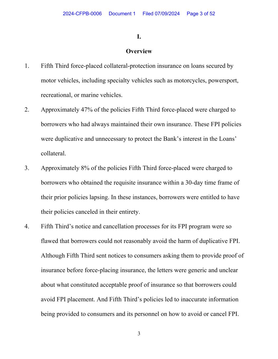3 I. Overview 1. Fifth Third force-placed collateral-protection insurance on loans secured by motor vehicles, including specialty vehicles such as motorcycles, powersport, recreational, or marine vehicles. 2. Approximately 47% of the policies Fifth Third force-placed were charged to borrowers who had always maintained their own insurance. These FPI policies were duplicative and unnecessary to protect the Bank’s interest in the Loans’ collateral. 3. Approximately 8% of the policies Fifth Third force-placed were charged to borrowers who obtained the requisite insurance within a 30-day time frame of their prior policies lapsing. In these instances, borrowers were entitled to have their policies canceled in their entirety. 4. Fifth Third’s notice and cancellation processes for its FPI program were so flawed that borrowers could not reasonably avoid the harm of duplicative FPI. Although Fifth Third sent notices to consumers asking them to provide proof of insurance before force-placing insurance, the letters were generic and unclear about what constituted acceptable proof of insurance so that borrowers could avoid FPI placement. And Fifth Third’s policies led to inaccurate information being provided to consumers and its personnel on how to avoid or cancel FPI. 2024-CFPB-0006 Document 1 Filed 07/09/2024 Page 3 of 52