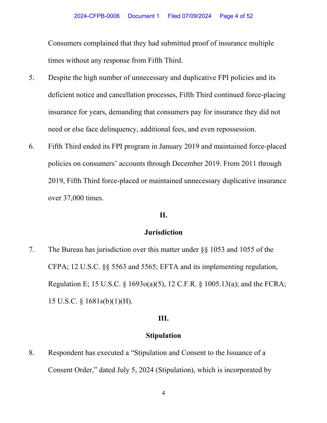 4 Consumers complained that they had submitted proof of insurance multiple times without any response from Fifth Third. 5. Despite the high number of unnecessary and duplicative FPI policies and its deficient notice and cancellation processes, Fifth Third continued force-placing insurance for years, demanding that consumers pay for insurance they did not need or else face delinquency, additional fees, and even repossession. 6. Fifth Third ended its FPI program in January 2019 and maintained force-placed policies on consumers’ accounts through December 2019. From 2011 through 2019, Fifth Third force-placed or maintained unnecessary duplicative insurance over 37,000 times. II. Jurisdiction 7. The Bureau has jurisdiction over this matter under §§ 1053 and 1055 of the CFPA; 12 U.S.C. §§ 5563 and 5565; EFTA and its implementing regulation, Regulation E; 15 U.S.C. § 1693o(a)(5), 12 C.F.R. § 1005.13(a); and the FCRA; 15 U.S.C. § 1681s(b)(1)(H). III. Stipulation 8. Respondent has executed a “Stipulation and Consent to the Issuance of a Consent Order,” dated July 5, 2024 (Stipulation), which is incorporated by 2024-CFPB-0006 Document 1 Filed 07/09/2024 Page 4 of 52