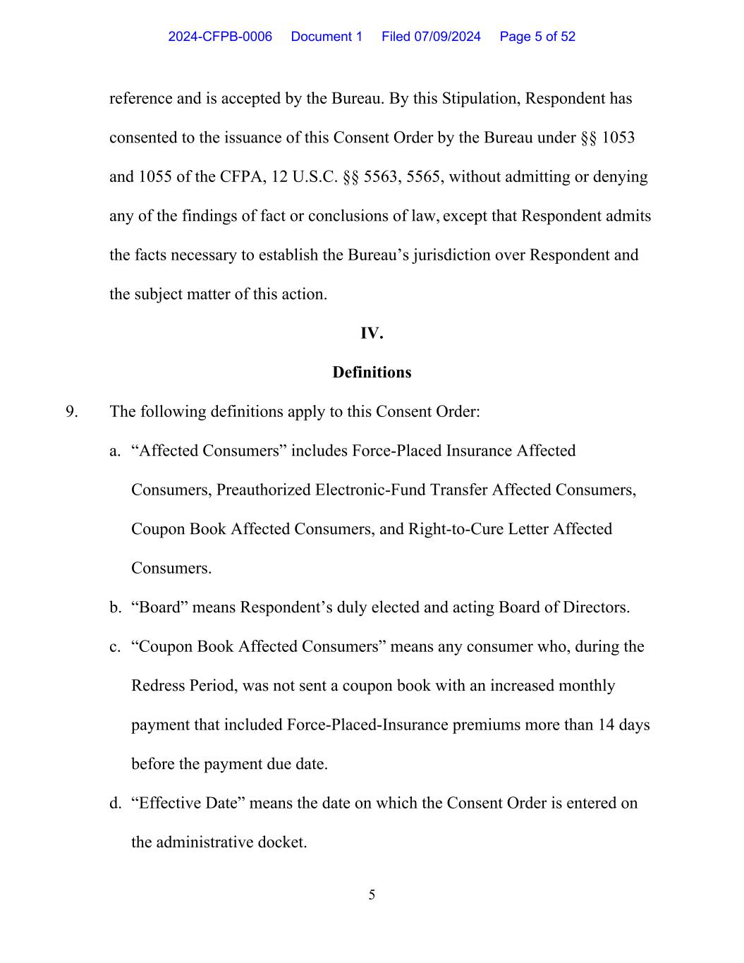 5 reference and is accepted by the Bureau. By this Stipulation, Respondent has consented to the issuance of this Consent Order by the Bureau under §§ 1053 and 1055 of the CFPA, 12 U.S.C. §§ 5563, 5565, without admitting or denying any of the findings of fact or conclusions of law, except that Respondent admits the facts necessary to establish the Bureau’s jurisdiction over Respondent and the subject matter of this action. IV. Definitions 9. The following definitions apply to this Consent Order: a. “Affected Consumers” includes Force-Placed Insurance Affected Consumers, Preauthorized Electronic-Fund Transfer Affected Consumers, Coupon Book Affected Consumers, and Right-to-Cure Letter Affected Consumers. b. “Board” means Respondent’s duly elected and acting Board of Directors. c. “Coupon Book Affected Consumers” means any consumer who, during the Redress Period, was not sent a coupon book with an increased monthly payment that included Force-Placed-Insurance premiums more than 14 days before the payment due date. d. “Effective Date” means the date on which the Consent Order is entered on the administrative docket. 2024-CFPB-0006 Document 1 Filed 07/09/2024 Page 5 of 52