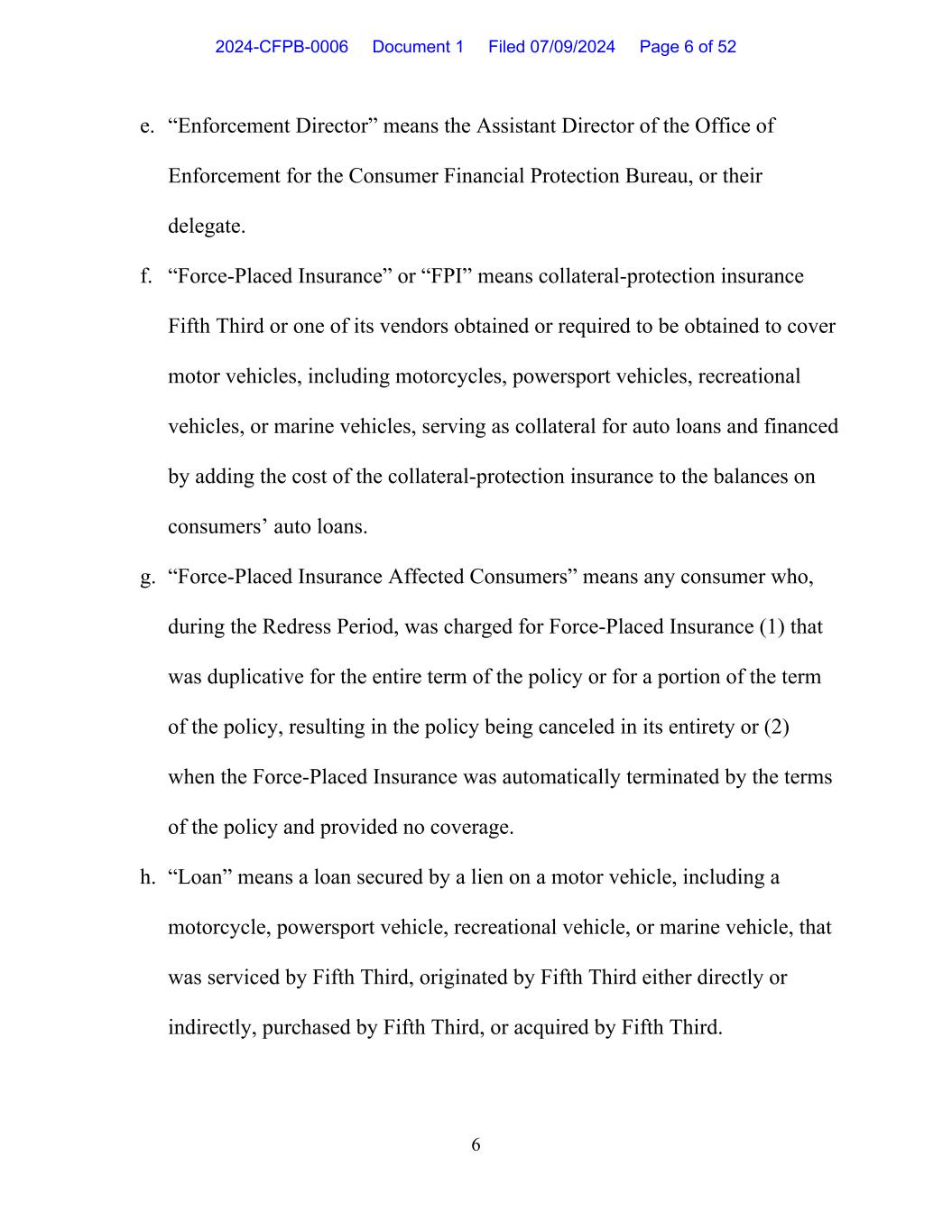 6 e. “Enforcement Director” means the Assistant Director of the Office of Enforcement for the Consumer Financial Protection Bureau, or their delegate. f. “Force-Placed Insurance” or “FPI” means collateral-protection insurance Fifth Third or one of its vendors obtained or required to be obtained to cover motor vehicles, including motorcycles, powersport vehicles, recreational vehicles, or marine vehicles, serving as collateral for auto loans and financed by adding the cost of the collateral-protection insurance to the balances on consumers’ auto loans. g. “Force-Placed Insurance Affected Consumers” means any consumer who, during the Redress Period, was charged for Force-Placed Insurance (1) that was duplicative for the entire term of the policy or for a portion of the term of the policy, resulting in the policy being canceled in its entirety or (2) when the Force-Placed Insurance was automatically terminated by the terms of the policy and provided no coverage. h. “Loan” means a loan secured by a lien on a motor vehicle, including a motorcycle, powersport vehicle, recreational vehicle, or marine vehicle, that was serviced by Fifth Third, originated by Fifth Third either directly or indirectly, purchased by Fifth Third, or acquired by Fifth Third. 2024-CFPB-0006 Document 1 Filed 07/09/2024 Page 6 of 52