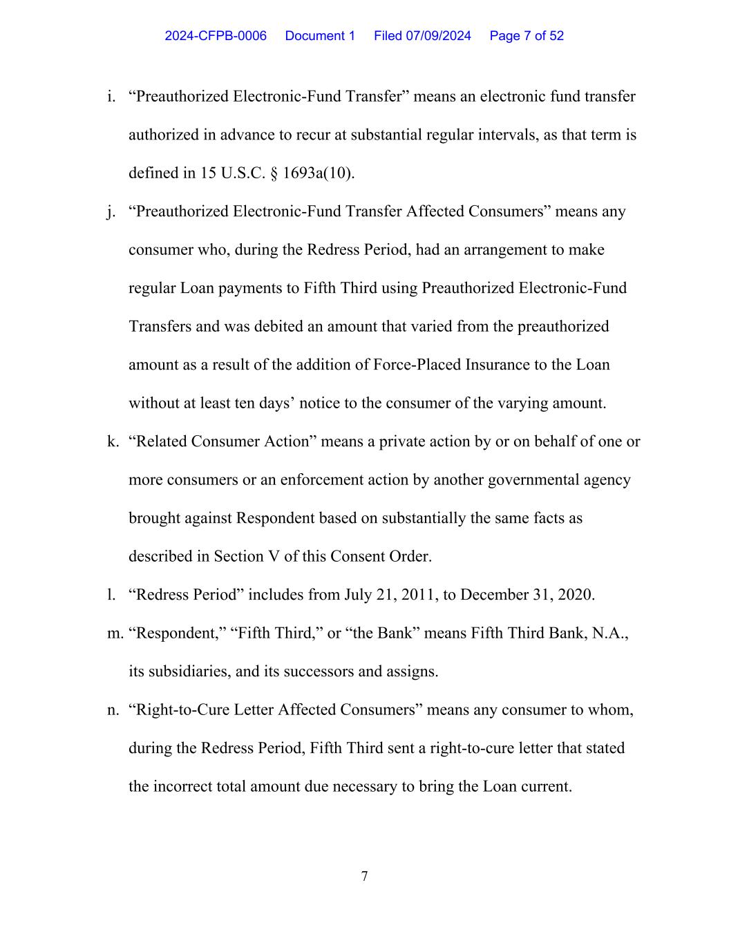 7 i. “Preauthorized Electronic-Fund Transfer” means an electronic fund transfer authorized in advance to recur at substantial regular intervals, as that term is defined in 15 U.S.C. § 1693a(10). j. “Preauthorized Electronic-Fund Transfer Affected Consumers” means any consumer who, during the Redress Period, had an arrangement to make regular Loan payments to Fifth Third using Preauthorized Electronic-Fund Transfers and was debited an amount that varied from the preauthorized amount as a result of the addition of Force-Placed Insurance to the Loan without at least ten days’ notice to the consumer of the varying amount. k. “Related Consumer Action” means a private action by or on behalf of one or more consumers or an enforcement action by another governmental agency brought against Respondent based on substantially the same facts as described in Section V of this Consent Order. l. “Redress Period” includes from July 21, 2011, to December 31, 2020. m. “Respondent,” “Fifth Third,” or “the Bank” means Fifth Third Bank, N.A., its subsidiaries, and its successors and assigns. n. “Right-to-Cure Letter Affected Consumers” means any consumer to whom, during the Redress Period, Fifth Third sent a right-to-cure letter that stated the incorrect total amount due necessary to bring the Loan current. 2024-CFPB-0006 Document 1 Filed 07/09/2024 Page 7 of 52