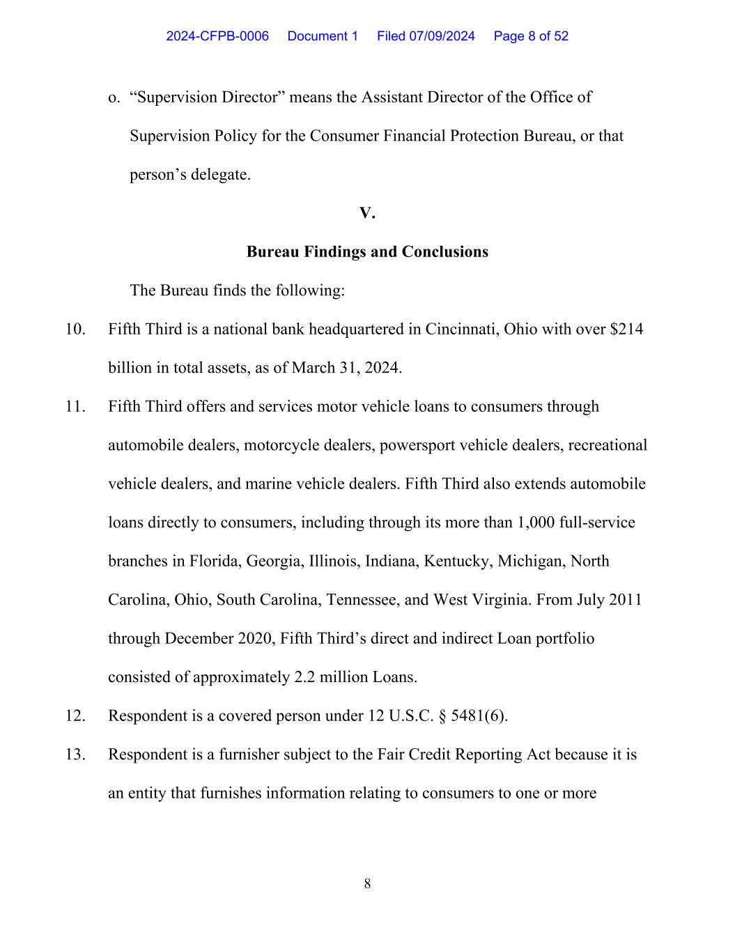 8 o. “Supervision Director” means the Assistant Director of the Office of Supervision Policy for the Consumer Financial Protection Bureau, or that person’s delegate. V. Bureau Findings and Conclusions The Bureau finds the following: 10. Fifth Third is a national bank headquartered in Cincinnati, Ohio with over $214 billion in total assets, as of March 31, 2024. 11. Fifth Third offers and services motor vehicle loans to consumers through automobile dealers, motorcycle dealers, powersport vehicle dealers, recreational vehicle dealers, and marine vehicle dealers. Fifth Third also extends automobile loans directly to consumers, including through its more than 1,000 full-service branches in Florida, Georgia, Illinois, Indiana, Kentucky, Michigan, North Carolina, Ohio, South Carolina, Tennessee, and West Virginia. From July 2011 through December 2020, Fifth Third’s direct and indirect Loan portfolio consisted of approximately 2.2 million Loans. 12. Respondent is a covered person under 12 U.S.C. § 5481(6). 13. Respondent is a furnisher subject to the Fair Credit Reporting Act because it is an entity that furnishes information relating to consumers to one or more 2024-CFPB-0006 Document 1 Filed 07/09/2024 Page 8 of 52