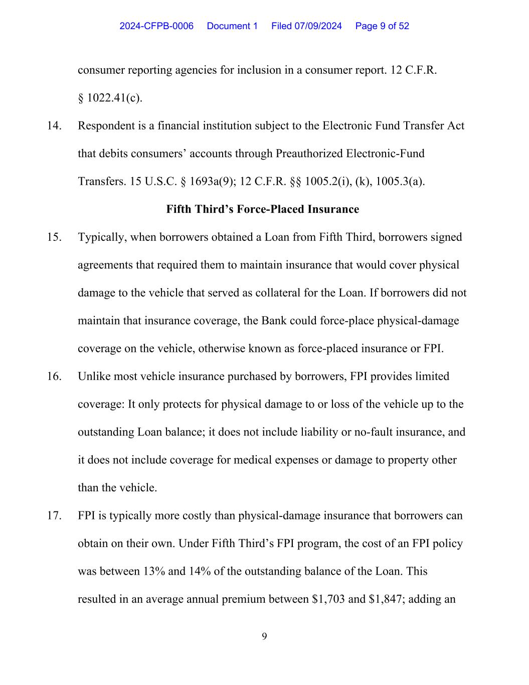 9 consumer reporting agencies for inclusion in a consumer report. 12 C.F.R. § 1022.41(c). 14. Respondent is a financial institution subject to the Electronic Fund Transfer Act that debits consumers’ accounts through Preauthorized Electronic-Fund Transfers. 15 U.S.C. § 1693a(9); 12 C.F.R. §§ 1005.2(i), (k), 1005.3(a). Fifth Third’s Force-Placed Insurance 15. Typically, when borrowers obtained a Loan from Fifth Third, borrowers signed agreements that required them to maintain insurance that would cover physical damage to the vehicle that served as collateral for the Loan. If borrowers did not maintain that insurance coverage, the Bank could force-place physical-damage coverage on the vehicle, otherwise known as force-placed insurance or FPI. 16. Unlike most vehicle insurance purchased by borrowers, FPI provides limited coverage: It only protects for physical damage to or loss of the vehicle up to the outstanding Loan balance; it does not include liability or no-fault insurance, and it does not include coverage for medical expenses or damage to property other than the vehicle. 17. FPI is typically more costly than physical-damage insurance that borrowers can obtain on their own. Under Fifth Third’s FPI program, the cost of an FPI policy was between 13% and 14% of the outstanding balance of the Loan. This resulted in an average annual premium between $1,703 and $1,847; adding an 2024-CFPB-0006 Document 1 Filed 07/09/2024 Page 9 of 52