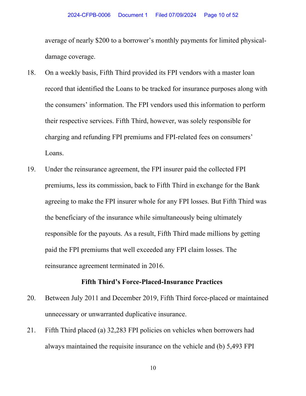 10 average of nearly $200 to a borrower’s monthly payments for limited physical- damage coverage. 18. On a weekly basis, Fifth Third provided its FPI vendors with a master loan record that identified the Loans to be tracked for insurance purposes along with the consumers’ information. The FPI vendors used this information to perform their respective services. Fifth Third, however, was solely responsible for charging and refunding FPI premiums and FPI-related fees on consumers’ Loans. 19. Under the reinsurance agreement, the FPI insurer paid the collected FPI premiums, less its commission, back to Fifth Third in exchange for the Bank agreeing to make the FPI insurer whole for any FPI losses. But Fifth Third was the beneficiary of the insurance while simultaneously being ultimately responsible for the payouts. As a result, Fifth Third made millions by getting paid the FPI premiums that well exceeded any FPI claim losses. The reinsurance agreement terminated in 2016. Fifth Third’s Force-Placed-Insurance Practices 20. Between July 2011 and December 2019, Fifth Third force-placed or maintained unnecessary or unwarranted duplicative insurance. 21. Fifth Third placed (a) 32,283 FPI policies on vehicles when borrowers had always maintained the requisite insurance on the vehicle and (b) 5,493 FPI 2024-CFPB-0006 Document 1 Filed 07/09/2024 Page 10 of 52