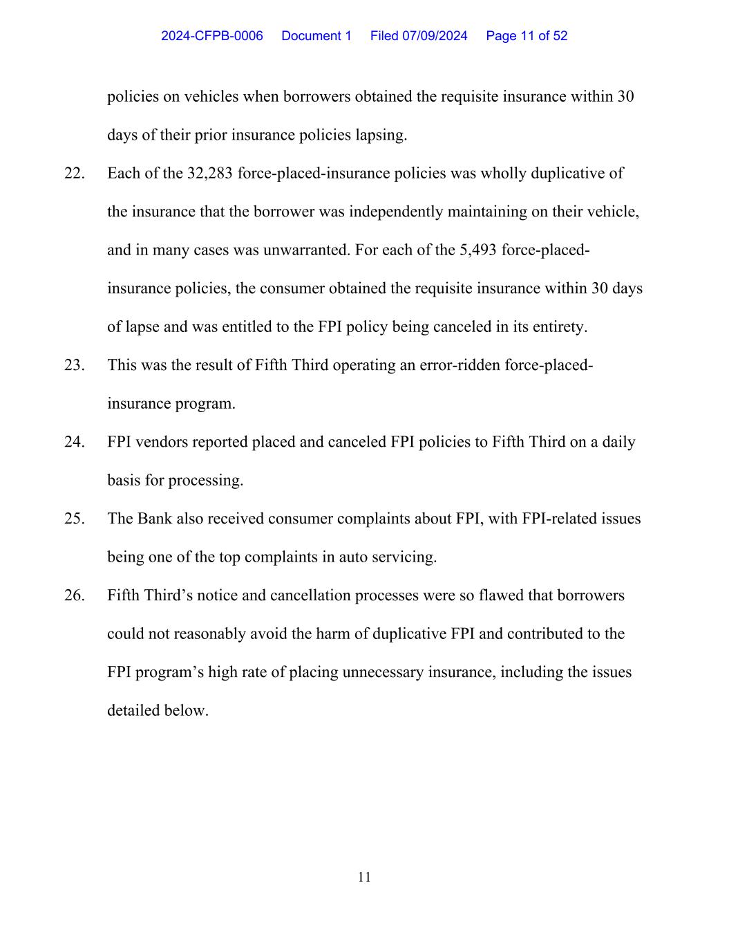 11 policies on vehicles when borrowers obtained the requisite insurance within 30 days of their prior insurance policies lapsing. 22. Each of the 32,283 force-placed-insurance policies was wholly duplicative of the insurance that the borrower was independently maintaining on their vehicle, and in many cases was unwarranted. For each of the 5,493 force-placed- insurance policies, the consumer obtained the requisite insurance within 30 days of lapse and was entitled to the FPI policy being canceled in its entirety. 23. This was the result of Fifth Third operating an error-ridden force-placed- insurance program. 24. FPI vendors reported placed and canceled FPI policies to Fifth Third on a daily basis for processing. 25. The Bank also received consumer complaints about FPI, with FPI-related issues being one of the top complaints in auto servicing. 26. Fifth Third’s notice and cancellation processes were so flawed that borrowers could not reasonably avoid the harm of duplicative FPI and contributed to the FPI program’s high rate of placing unnecessary insurance, including the issues detailed below. 2024-CFPB-0006 Document 1 Filed 07/09/2024 Page 11 of 52