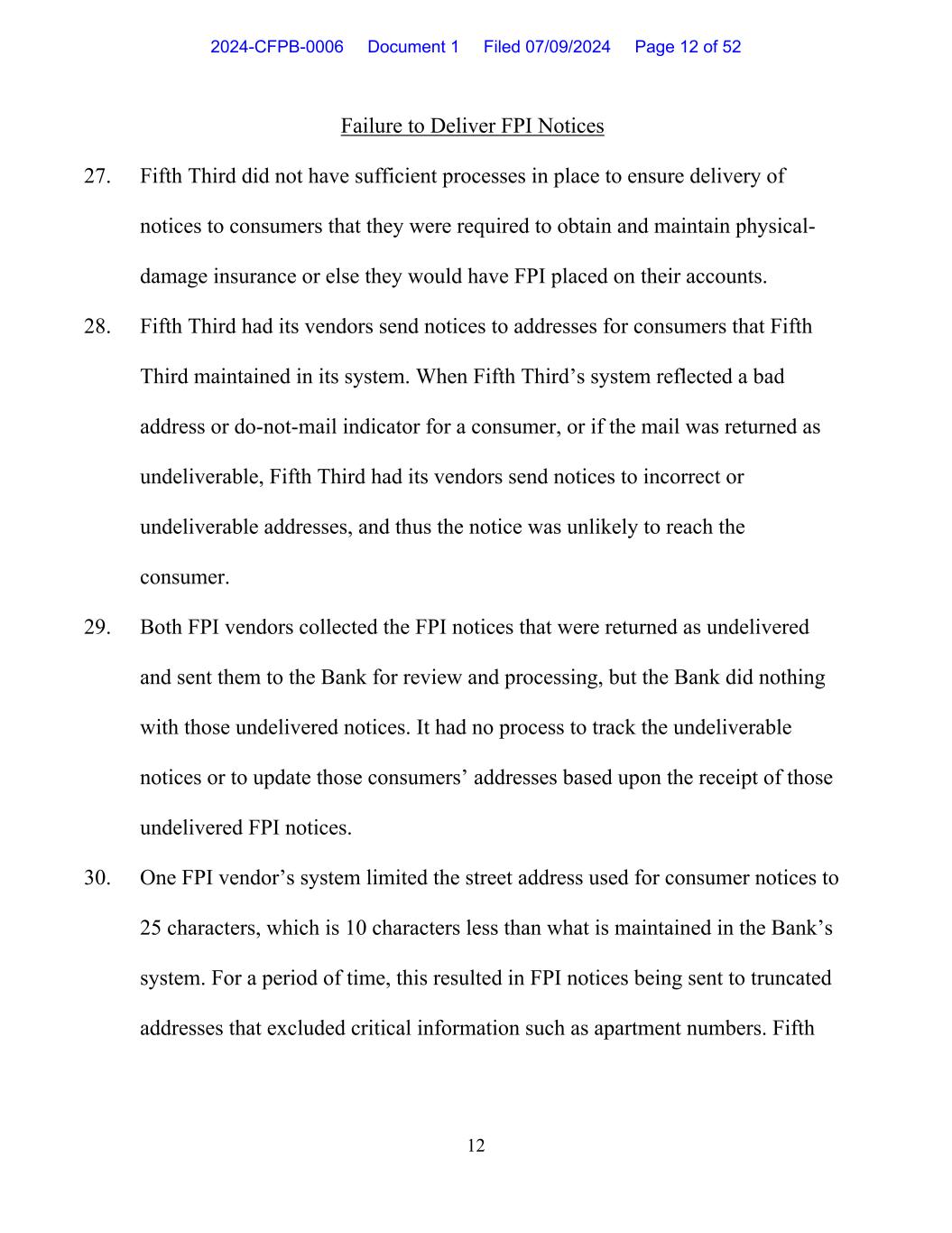 12 Failure to Deliver FPI Notices 27. Fifth Third did not have sufficient processes in place to ensure delivery of notices to consumers that they were required to obtain and maintain physical- damage insurance or else they would have FPI placed on their accounts. 28. Fifth Third had its vendors send notices to addresses for consumers that Fifth Third maintained in its system. When Fifth Third’s system reflected a bad address or do-not-mail indicator for a consumer, or if the mail was returned as undeliverable, Fifth Third had its vendors send notices to incorrect or undeliverable addresses, and thus the notice was unlikely to reach the consumer. 29. Both FPI vendors collected the FPI notices that were returned as undelivered and sent them to the Bank for review and processing, but the Bank did nothing with those undelivered notices. It had no process to track the undeliverable notices or to update those consumers’ addresses based upon the receipt of those undelivered FPI notices. 30. One FPI vendor’s system limited the street address used for consumer notices to 25 characters, which is 10 characters less than what is maintained in the Bank’s system. For a period of time, this resulted in FPI notices being sent to truncated addresses that excluded critical information such as apartment numbers. Fifth 2024-CFPB-0006 Document 1 Filed 07/09/2024 Page 12 of 52