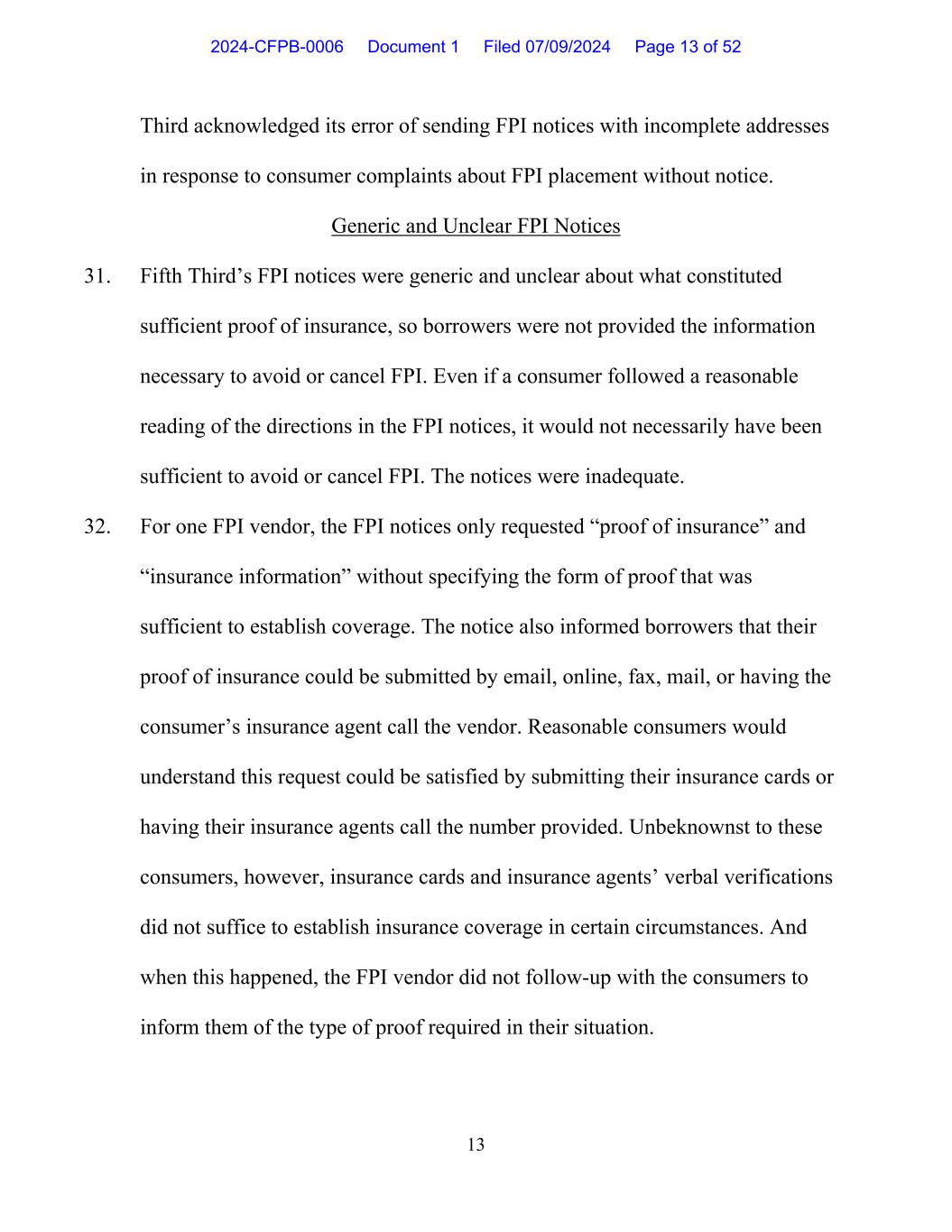 13 Third acknowledged its error of sending FPI notices with incomplete addresses in response to consumer complaints about FPI placement without notice. Generic and Unclear FPI Notices 31. Fifth Third’s FPI notices were generic and unclear about what constituted sufficient proof of insurance, so borrowers were not provided the information necessary to avoid or cancel FPI. Even if a consumer followed a reasonable reading of the directions in the FPI notices, it would not necessarily have been sufficient to avoid or cancel FPI. The notices were inadequate. 32. For one FPI vendor, the FPI notices only requested “proof of insurance” and “insurance information” without specifying the form of proof that was sufficient to establish coverage. The notice also informed borrowers that their proof of insurance could be submitted by email, online, fax, mail, or having the consumer’s insurance agent call the vendor. Reasonable consumers would understand this request could be satisfied by submitting their insurance cards or having their insurance agents call the number provided. Unbeknownst to these consumers, however, insurance cards and insurance agents’ verbal verifications did not suffice to establish insurance coverage in certain circumstances. And when this happened, the FPI vendor did not follow-up with the consumers to inform them of the type of proof required in their situation. 2024-CFPB-0006 Document 1 Filed 07/09/2024 Page 13 of 52