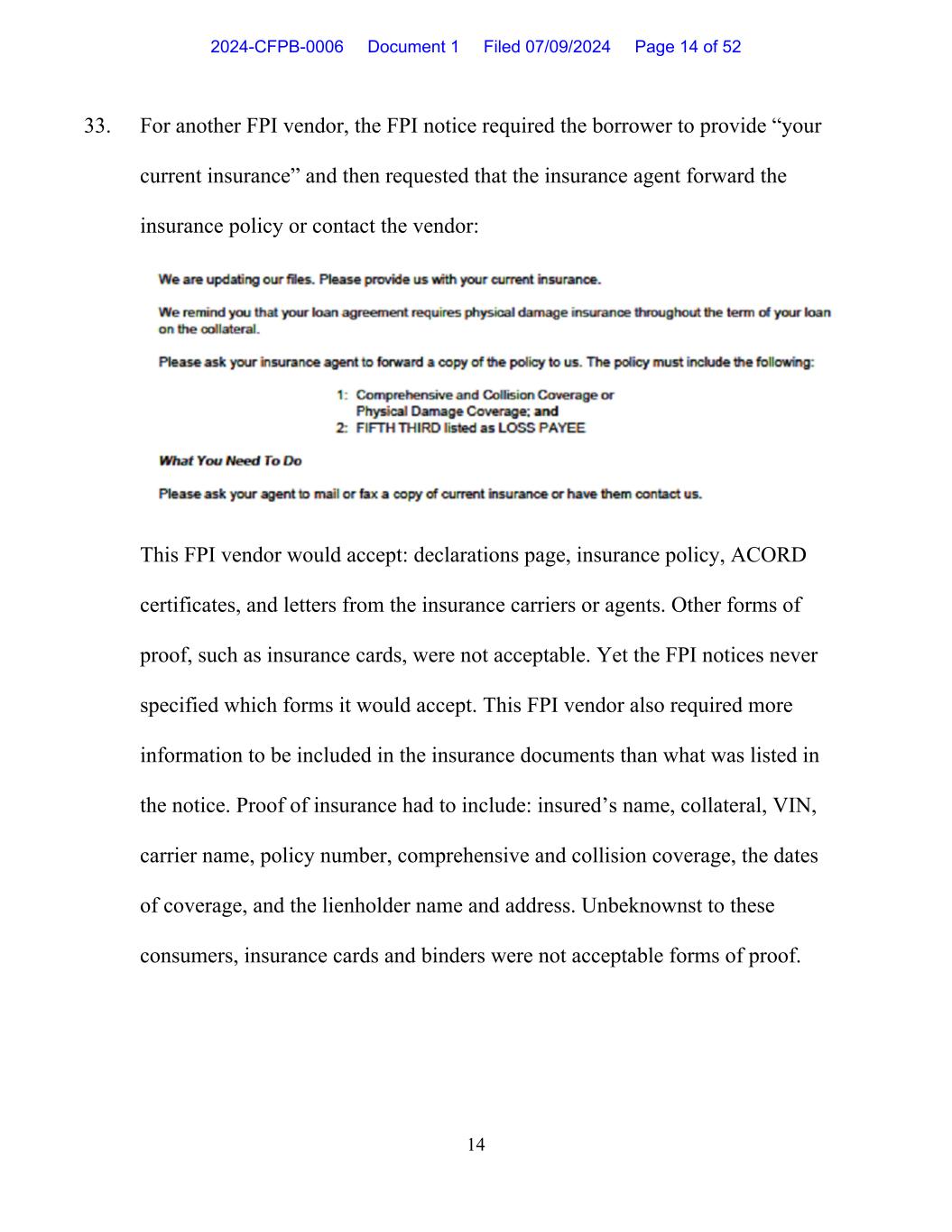 14 33. For another FPI vendor, the FPI notice required the borrower to provide “your current insurance” and then requested that the insurance agent forward the insurance policy or contact the vendor: This FPI vendor would accept: declarations page, insurance policy, ACORD certificates, and letters from the insurance carriers or agents. Other forms of proof, such as insurance cards, were not acceptable. Yet the FPI notices never specified which forms it would accept. This FPI vendor also required more information to be included in the insurance documents than what was listed in the notice. Proof of insurance had to include: insured’s name, collateral, VIN, carrier name, policy number, comprehensive and collision coverage, the dates of coverage, and the lienholder name and address. Unbeknownst to these consumers, insurance cards and binders were not acceptable forms of proof. We are upd ·ng our . Please provide ,us • you current insuran<ie. We re • d you th your loan reemen requires physical damage insurance ltw-oughout ,on the ooil l era!. tenn of your loan Please .as your insuran<ie agent to ,forward a copy ,of the policy to us. The poGcy must include e fo'llowing:: 1: Comprehensive and Co isionCoverageOf' Ph • Damage Co e: ~ 2: F FTH TI-HRD isled as LOSS PAYEE What You Need To Do Please ask your agent ID mail or fax a copy of current insurance or h ve them oon ct us. 2024-CFPB-0006 Document 1 Filed 07/09/2024 Page 14 of 52