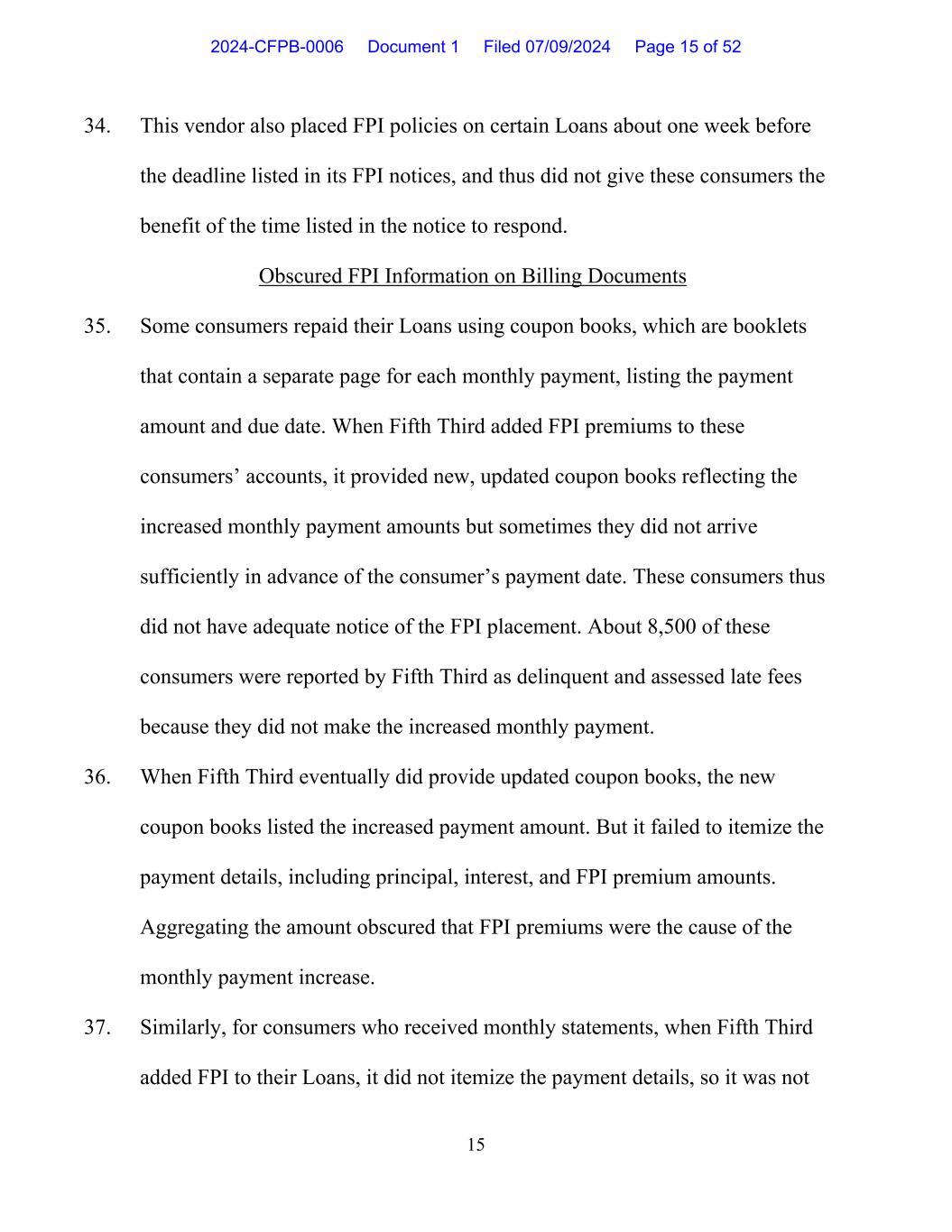15 34. This vendor also placed FPI policies on certain Loans about one week before the deadline listed in its FPI notices, and thus did not give these consumers the benefit of the time listed in the notice to respond. Obscured FPI Information on Billing Documents 35. Some consumers repaid their Loans using coupon books, which are booklets that contain a separate page for each monthly payment, listing the payment amount and due date. When Fifth Third added FPI premiums to these consumers’ accounts, it provided new, updated coupon books reflecting the increased monthly payment amounts but sometimes they did not arrive sufficiently in advance of the consumer’s payment date. These consumers thus did not have adequate notice of the FPI placement. About 8,500 of these consumers were reported by Fifth Third as delinquent and assessed late fees because they did not make the increased monthly payment. 36. When Fifth Third eventually did provide updated coupon books, the new coupon books listed the increased payment amount. But it failed to itemize the payment details, including principal, interest, and FPI premium amounts. Aggregating the amount obscured that FPI premiums were the cause of the monthly payment increase. 37. Similarly, for consumers who received monthly statements, when Fifth Third added FPI to their Loans, it did not itemize the payment details, so it was not 2024-CFPB-0006 Document 1 Filed 07/09/2024 Page 15 of 52