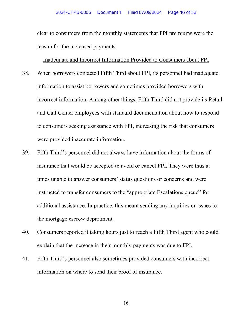 16 clear to consumers from the monthly statements that FPI premiums were the reason for the increased payments. Inadequate and Incorrect Information Provided to Consumers about FPI 38. When borrowers contacted Fifth Third about FPI, its personnel had inadequate information to assist borrowers and sometimes provided borrowers with incorrect information. Among other things, Fifth Third did not provide its Retail and Call Center employees with standard documentation about how to respond to consumers seeking assistance with FPI, increasing the risk that consumers were provided inaccurate information. 39. Fifth Third’s personnel did not always have information about the forms of insurance that would be accepted to avoid or cancel FPI. They were thus at times unable to answer consumers’ status questions or concerns and were instructed to transfer consumers to the “appropriate Escalations queue” for additional assistance. In practice, this meant sending any inquiries or issues to the mortgage escrow department. 40. Consumers reported it taking hours just to reach a Fifth Third agent who could explain that the increase in their monthly payments was due to FPI. 41. Fifth Third’s personnel also sometimes provided consumers with incorrect information on where to send their proof of insurance. 2024-CFPB-0006 Document 1 Filed 07/09/2024 Page 16 of 52