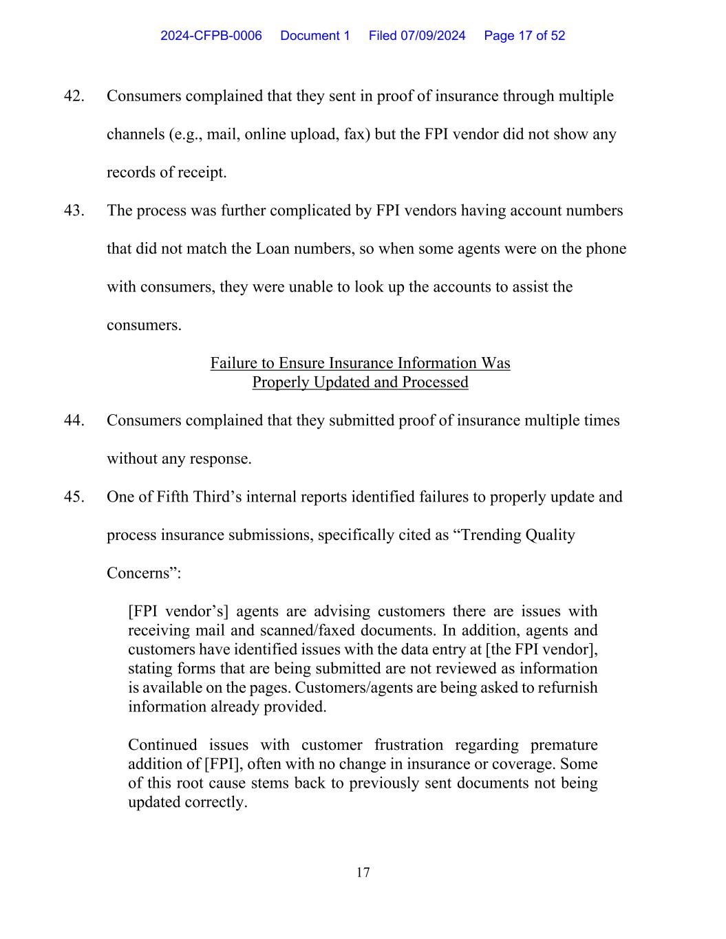 17 42. Consumers complained that they sent in proof of insurance through multiple channels (e.g., mail, online upload, fax) but the FPI vendor did not show any records of receipt. 43. The process was further complicated by FPI vendors having account numbers that did not match the Loan numbers, so when some agents were on the phone with consumers, they were unable to look up the accounts to assist the consumers. Failure to Ensure Insurance Information Was Properly Updated and Processed 44. Consumers complained that they submitted proof of insurance multiple times without any response. 45. One of Fifth Third’s internal reports identified failures to properly update and process insurance submissions, specifically cited as “Trending Quality Concerns”: [FPI vendor’s] agents are advising customers there are issues with receiving mail and scanned/faxed documents. In addition, agents and customers have identified issues with the data entry at [the FPI vendor], stating forms that are being submitted are not reviewed as information is available on the pages. Customers/agents are being asked to refurnish information already provided. Continued issues with customer frustration regarding premature addition of [FPI], often with no change in insurance or coverage. Some of this root cause stems back to previously sent documents not being updated correctly. 2024-CFPB-0006 Document 1 Filed 07/09/2024 Page 17 of 52