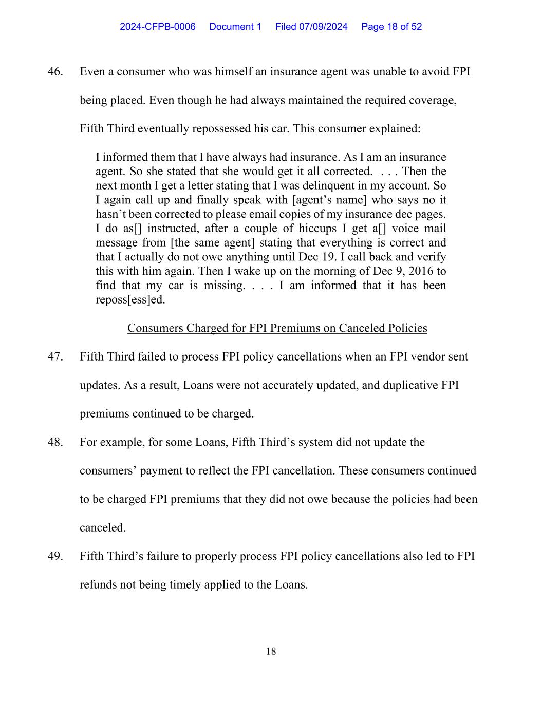 18 46. Even a consumer who was himself an insurance agent was unable to avoid FPI being placed. Even though he had always maintained the required coverage, Fifth Third eventually repossessed his car. This consumer explained: I informed them that I have always had insurance. As I am an insurance agent. So she stated that she would get it all corrected. . . . Then the next month I get a letter stating that I was delinquent in my account. So I again call up and finally speak with [agent’s name] who says no it hasn’t been corrected to please email copies of my insurance dec pages. I do as[] instructed, after a couple of hiccups I get a[] voice mail message from [the same agent] stating that everything is correct and that I actually do not owe anything until Dec 19. I call back and verify this with him again. Then I wake up on the morning of Dec 9, 2016 to find that my car is missing. . . . I am informed that it has been reposs[ess]ed. Consumers Charged for FPI Premiums on Canceled Policies 47. Fifth Third failed to process FPI policy cancellations when an FPI vendor sent updates. As a result, Loans were not accurately updated, and duplicative FPI premiums continued to be charged. 48. For example, for some Loans, Fifth Third’s system did not update the consumers’ payment to reflect the FPI cancellation. These consumers continued to be charged FPI premiums that they did not owe because the policies had been canceled. 49. Fifth Third’s failure to properly process FPI policy cancellations also led to FPI refunds not being timely applied to the Loans. 2024-CFPB-0006 Document 1 Filed 07/09/2024 Page 18 of 52